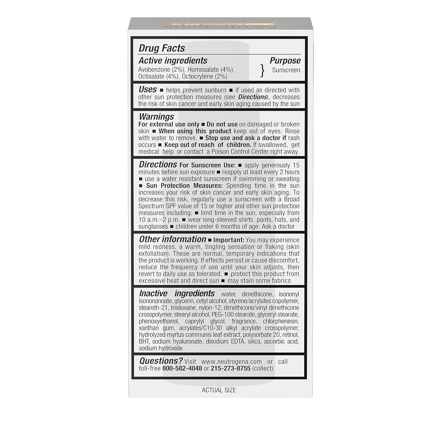 Water, Dimethicone, Isononyl Isononanoate, Glycerin, Cetyl Alcohol, Styrene/Acrylates Copolymer, Stealth-21, Trisoloxane, Nylon-12, Dimethicone/Vinyl Dimethicone Crosspolymer, Stearyl Alcohol, PEG-100 Stearate, Glyceryl Stearate, Phenoxyethanol, Caprylyl Glycol, Fragrance, Chlorphenesin, Xanthan Gum, Acrylates/C10-30 Alkyl Acrylate Crosspolymer, Hydrolyzed Myrtus Communis Leaf Extract, Polysorbate 20, Retinol, BHT, Sodium Hyaluronate, Disodium EDTA, Silica, Ascorbic Acid, Sodium Hydroxide, Avobenzone, Homosalate, Octisalate, Octocrylene