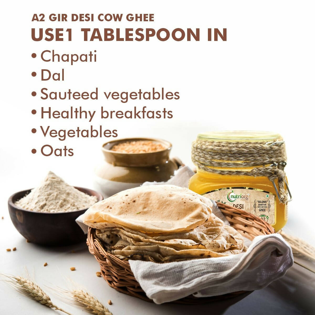 Nutriorg Pure Desi Gir Cow Ghee is made from desi cow milk from our own cows which are grass-fed & allowed to graze freely in the open. Most importantly our calves are given first milking preferences. After the calf has had her/his due, the milk is removed by hand and then boiled to make curd. The whole curd is churned with a wooden churner in the traditional method. The butter derived from this method then turned into vedic ghee through a slow heating process. The process of creating traditional ghee is complete once the water has evaporated and butter has separated from the milk solids.