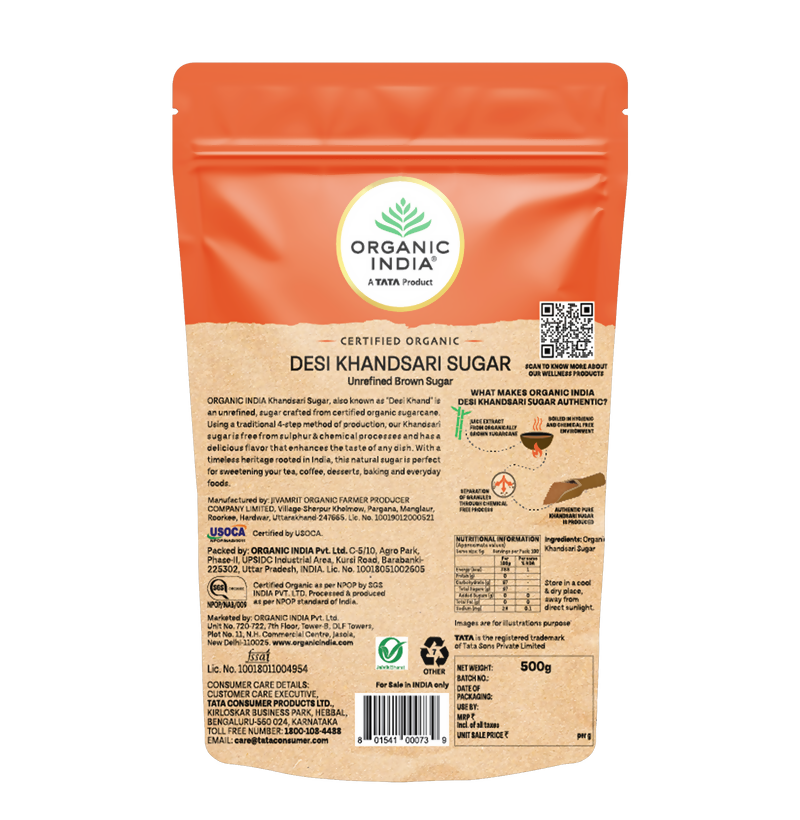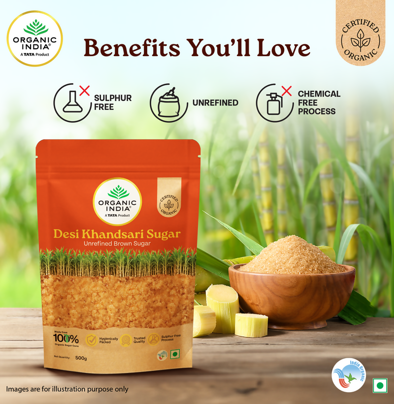 Organic India Desi Khandsari Sugar is an unrefined sugar made from certified organic sugarcane. The sugar is prepared using a traditional four-step method and comes in a package designed for convenient use. It can be used to sweeten beverages, desserts, baked goods, and other foods.
