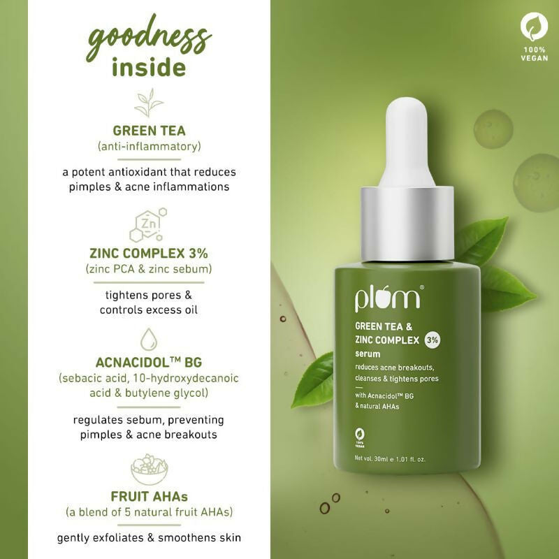Plum Green Tea & 3% Zinc Complex Face Serum with Acnacidol BG - Fights Acne, Pimples & Controls Oil