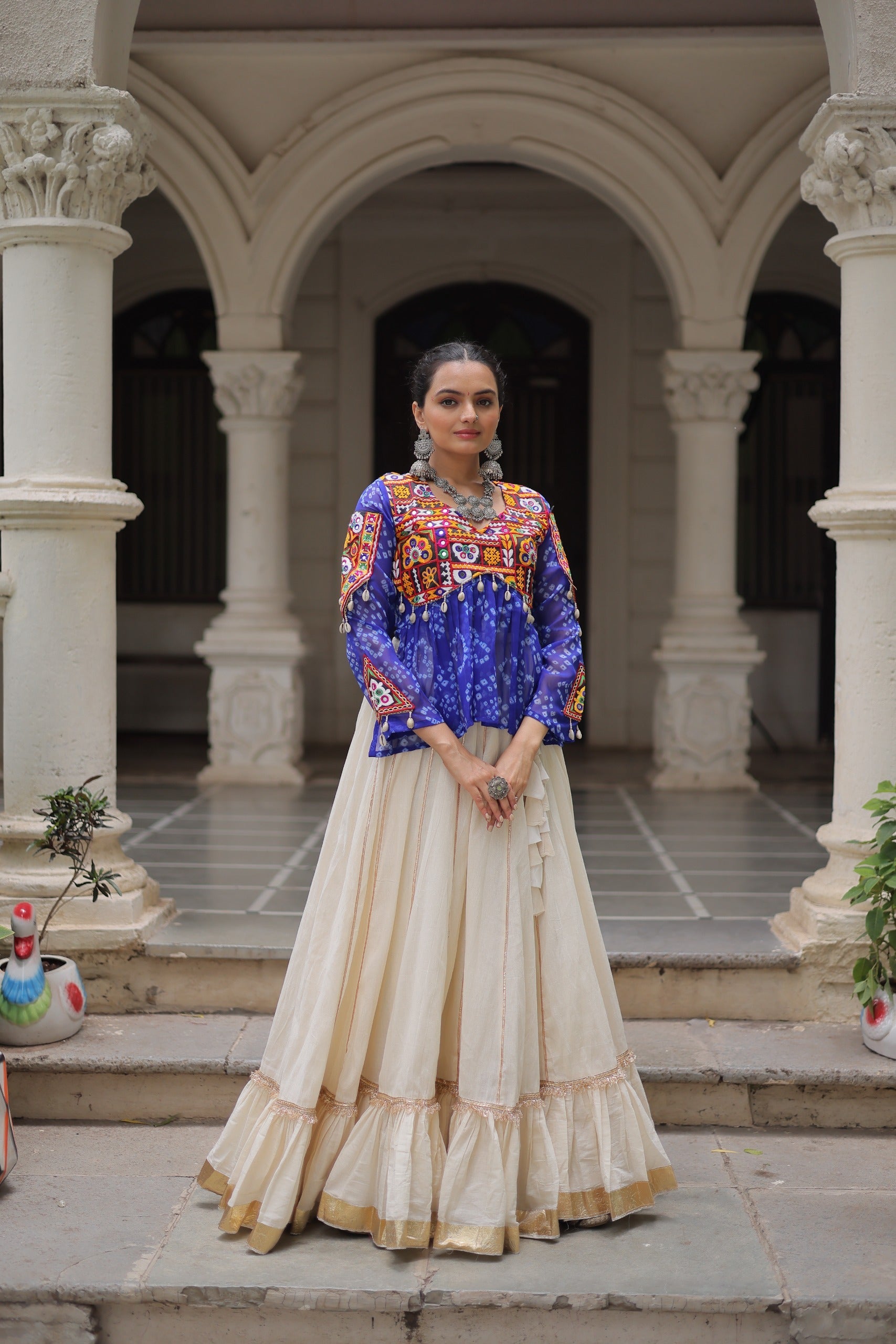 Prazu Fashion Blue Georgette Bandhani Print With Kutchi Gamthi Navratri Lehenga
