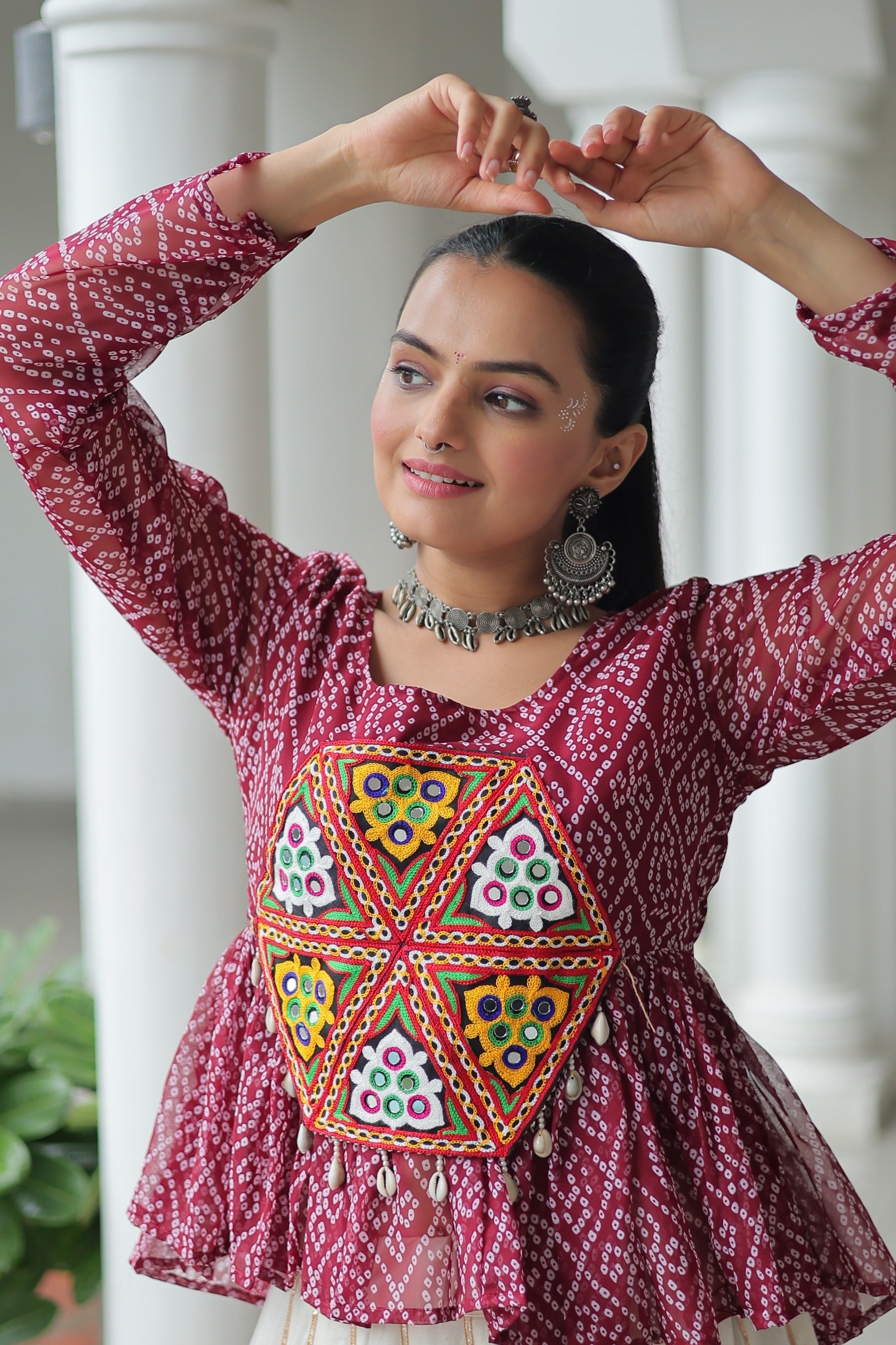 Prazu Fashion Wine Georgette Bandhani Print With Kutchi Gamthi Patchwork Navratri Lehenga