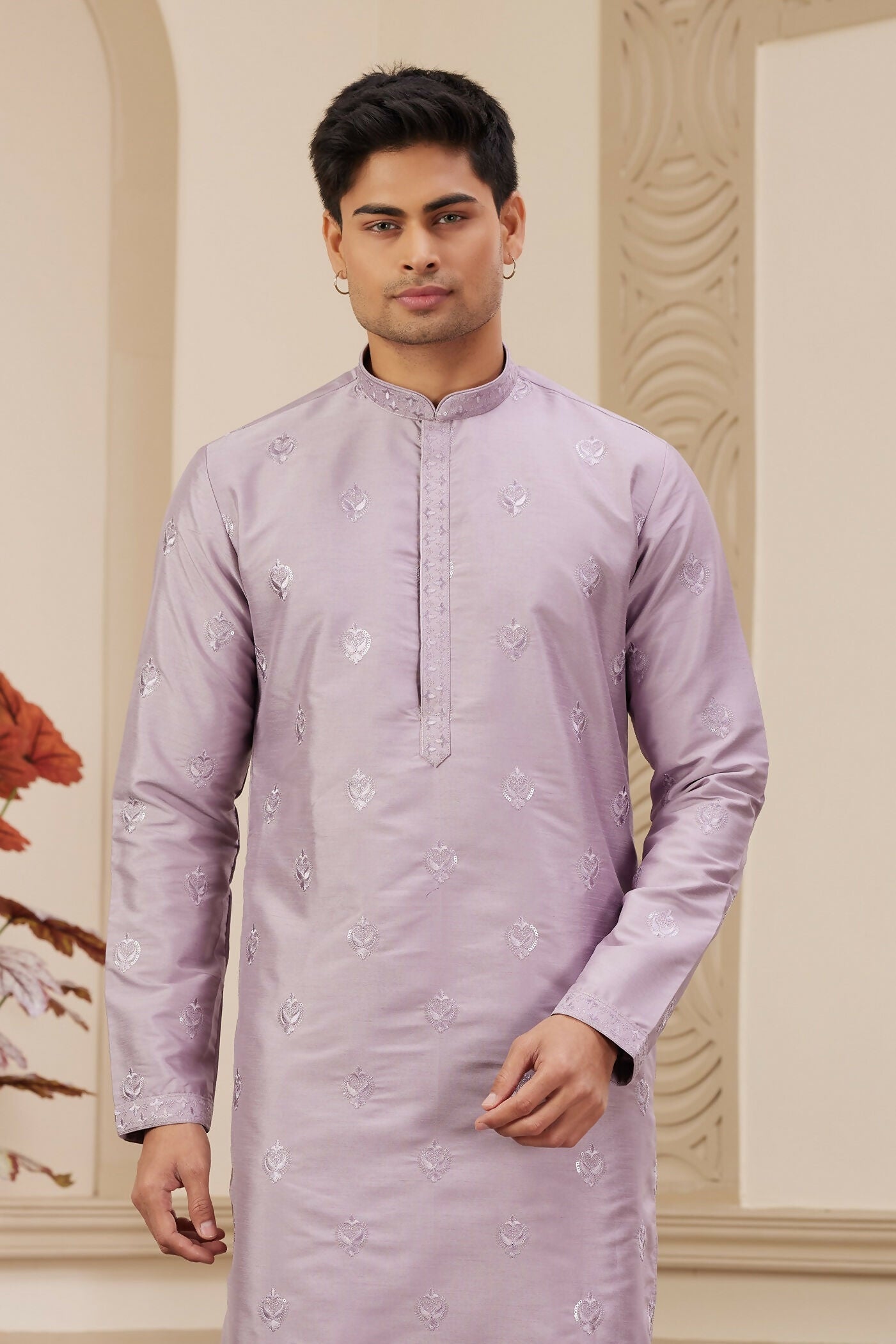 Raivat Ethnic Men's Art Silk Thread Work Kurta Pyjama In Light Purple Colour