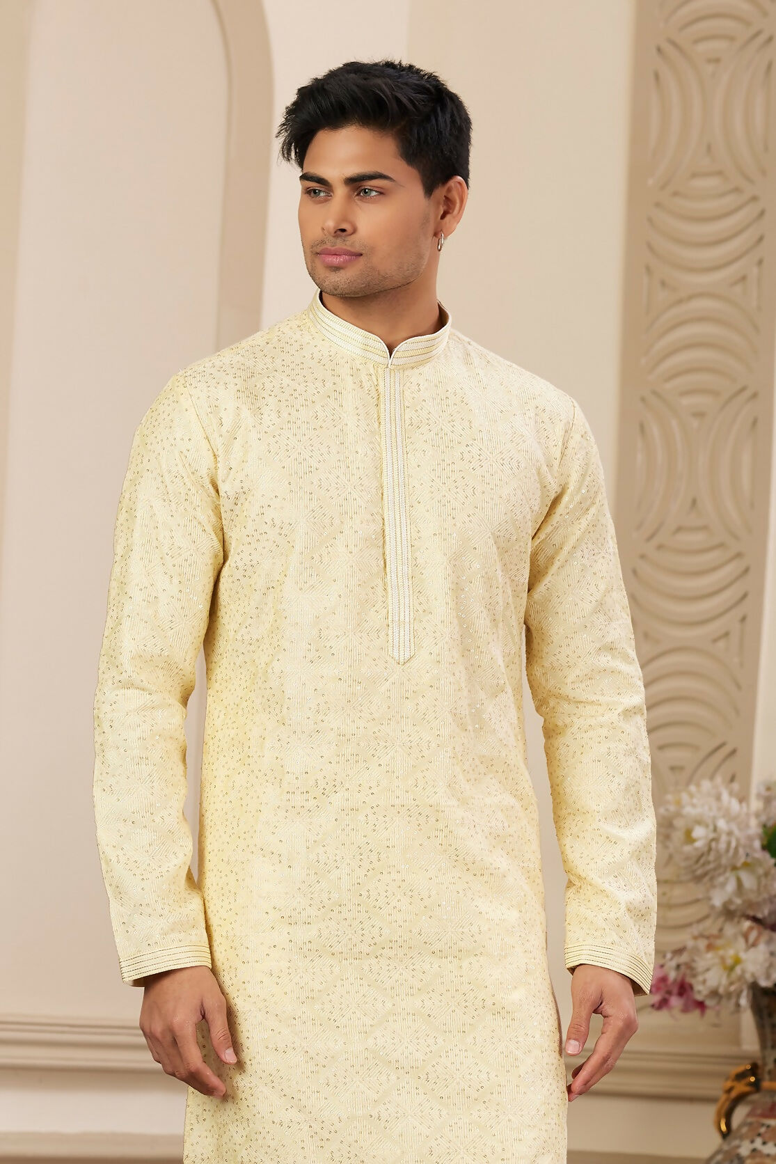 Raivat Ethnic Men's Art Silk Thread Work Kurta Pyjama In Yellow Colour