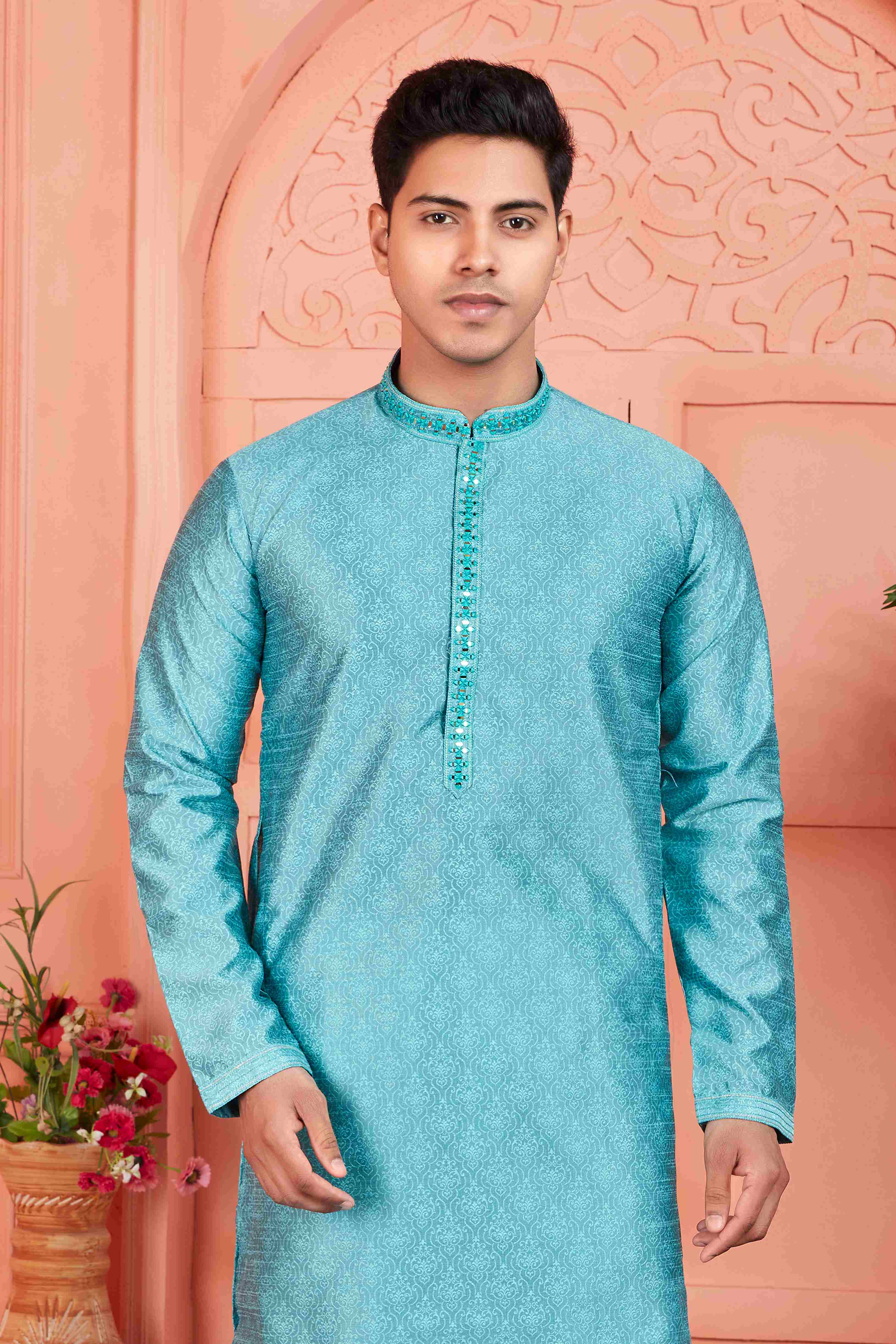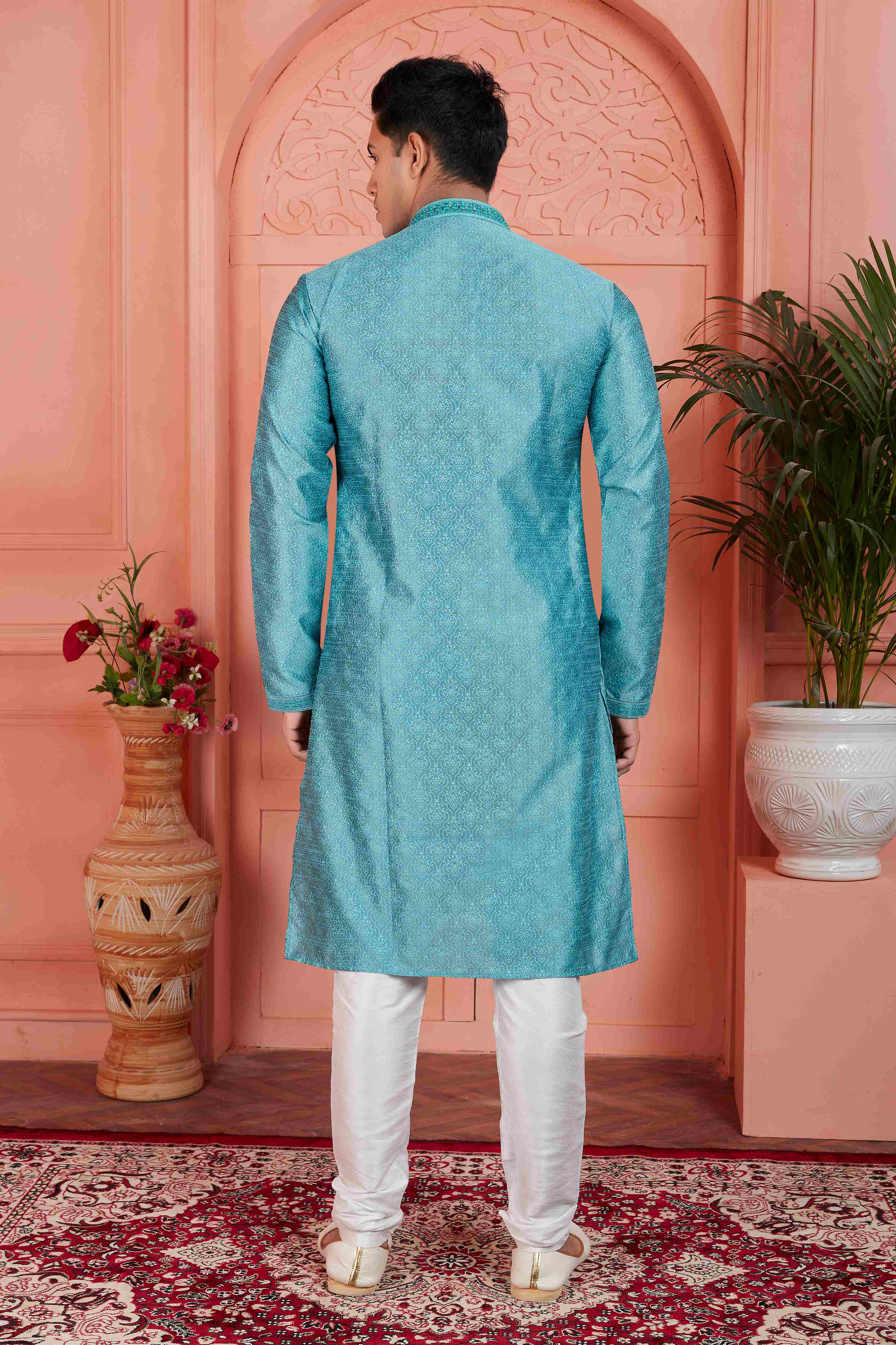 Raivat Ethnic Men's Jacquard Silk Brocade Mirror and Pintux Work Kurta Pyjama In Blue Colour