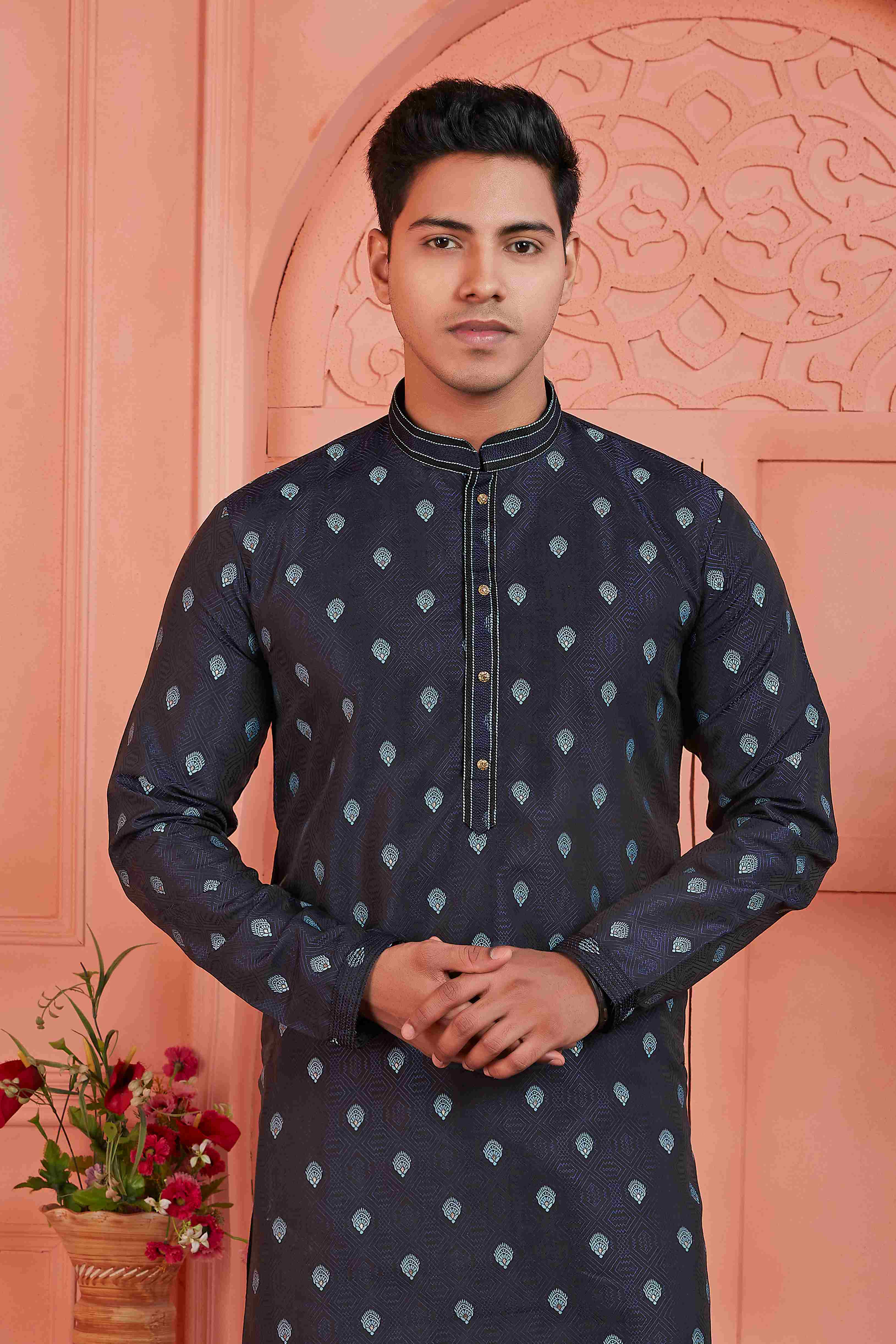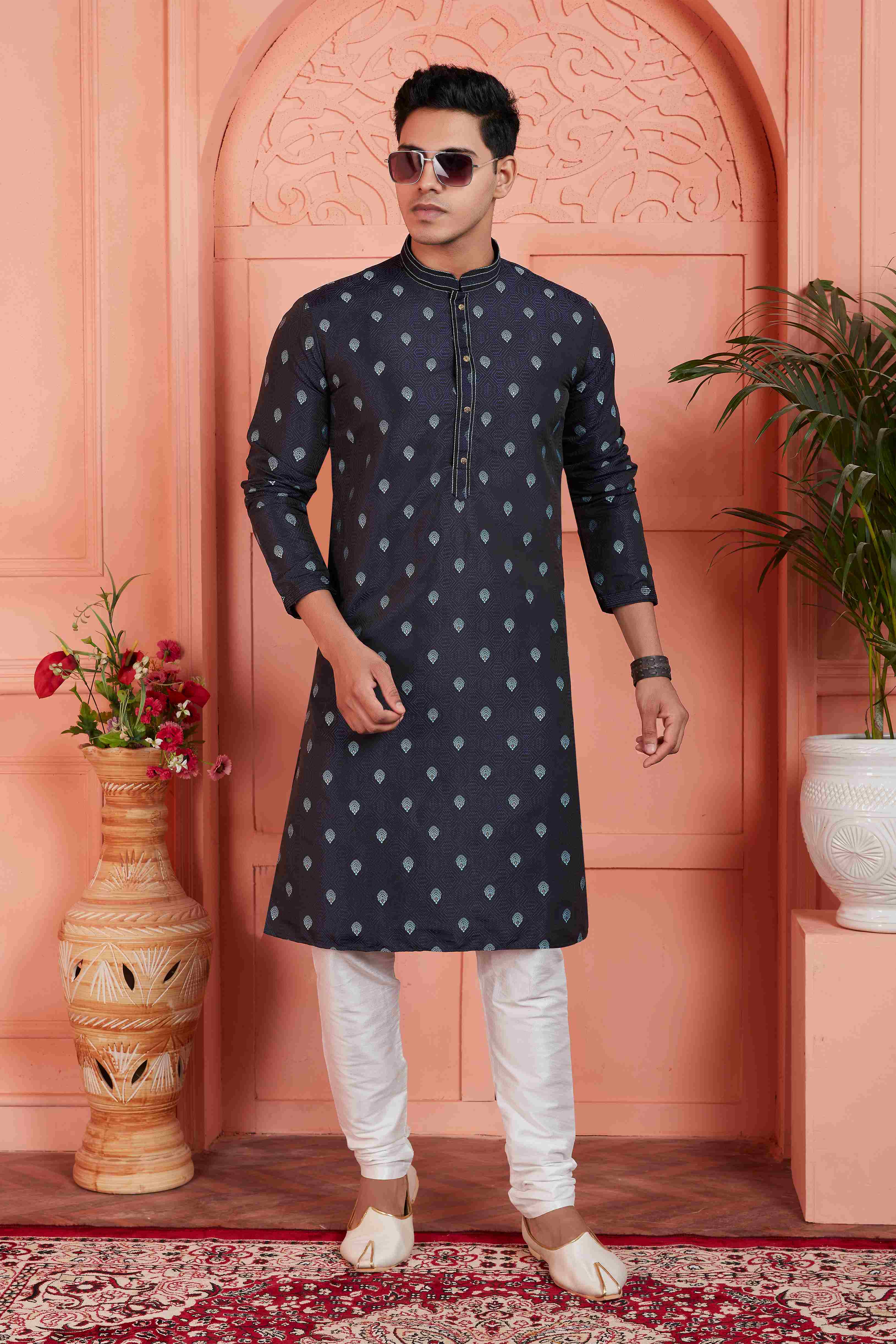 Raivat Ethnic Men's Jacquard Silk Brocade Pintux Work Kurta Pyjama In Blue Colour