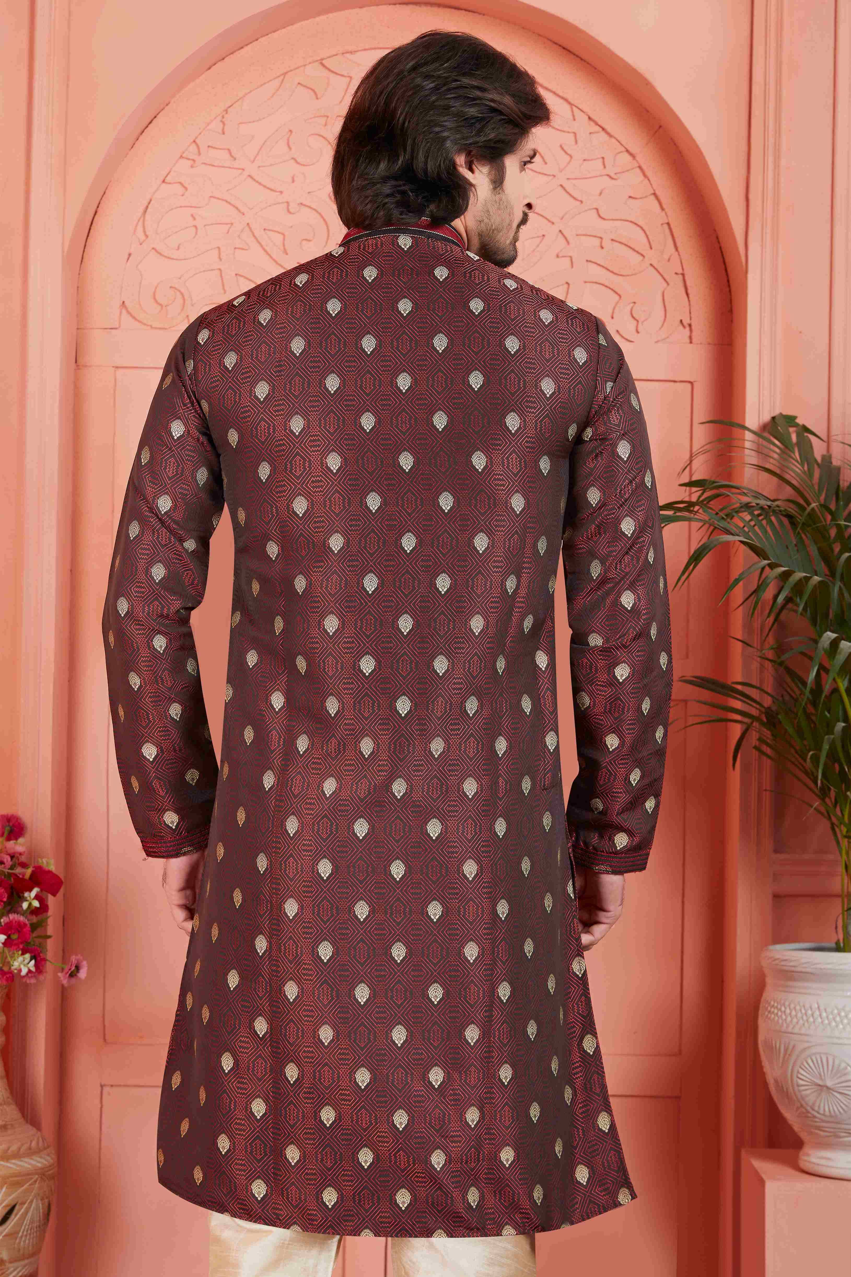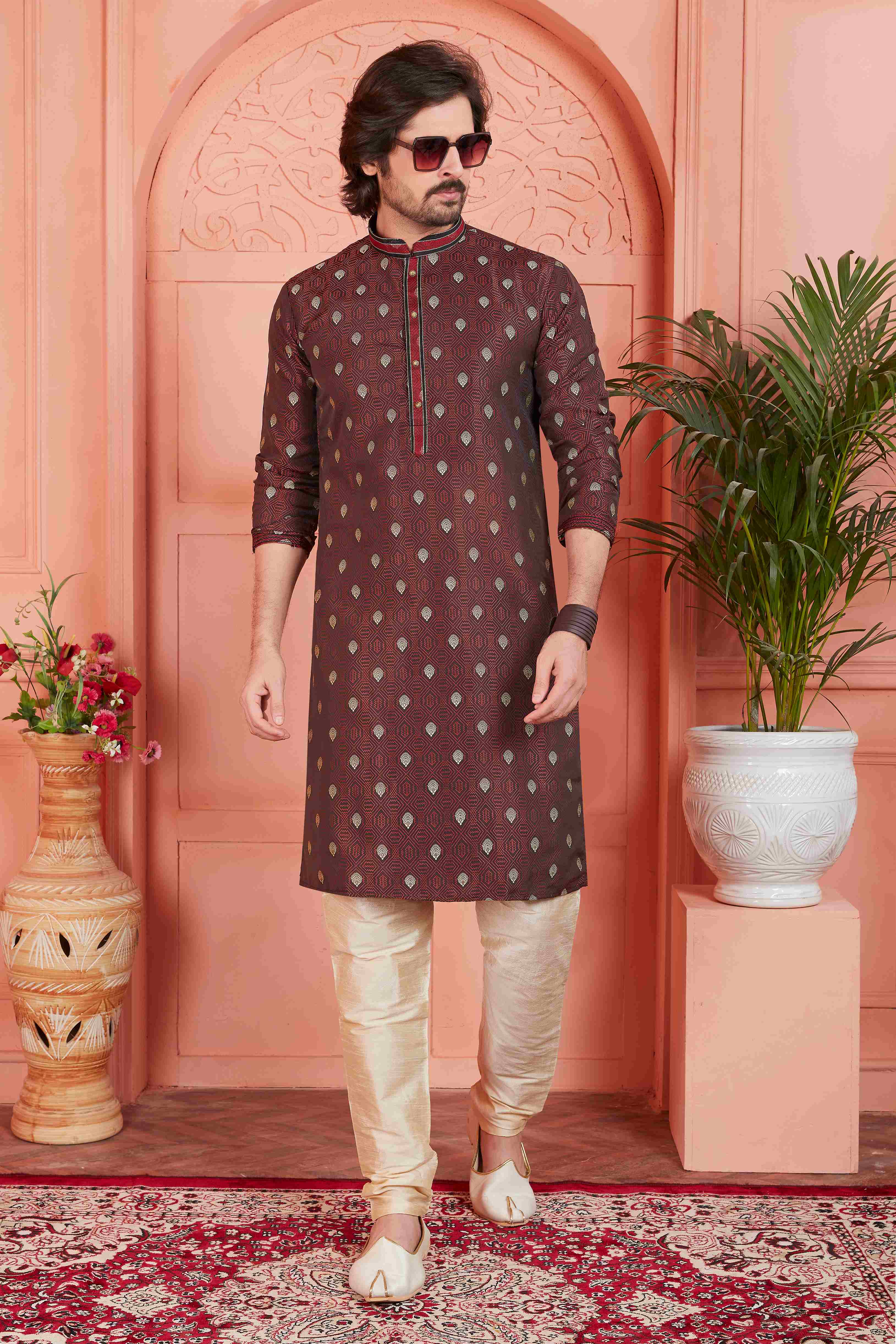 Raivat Ethnic Men's Jacquard Silk Brocade Pintux Work Kurta Pyjama In Brown Colour