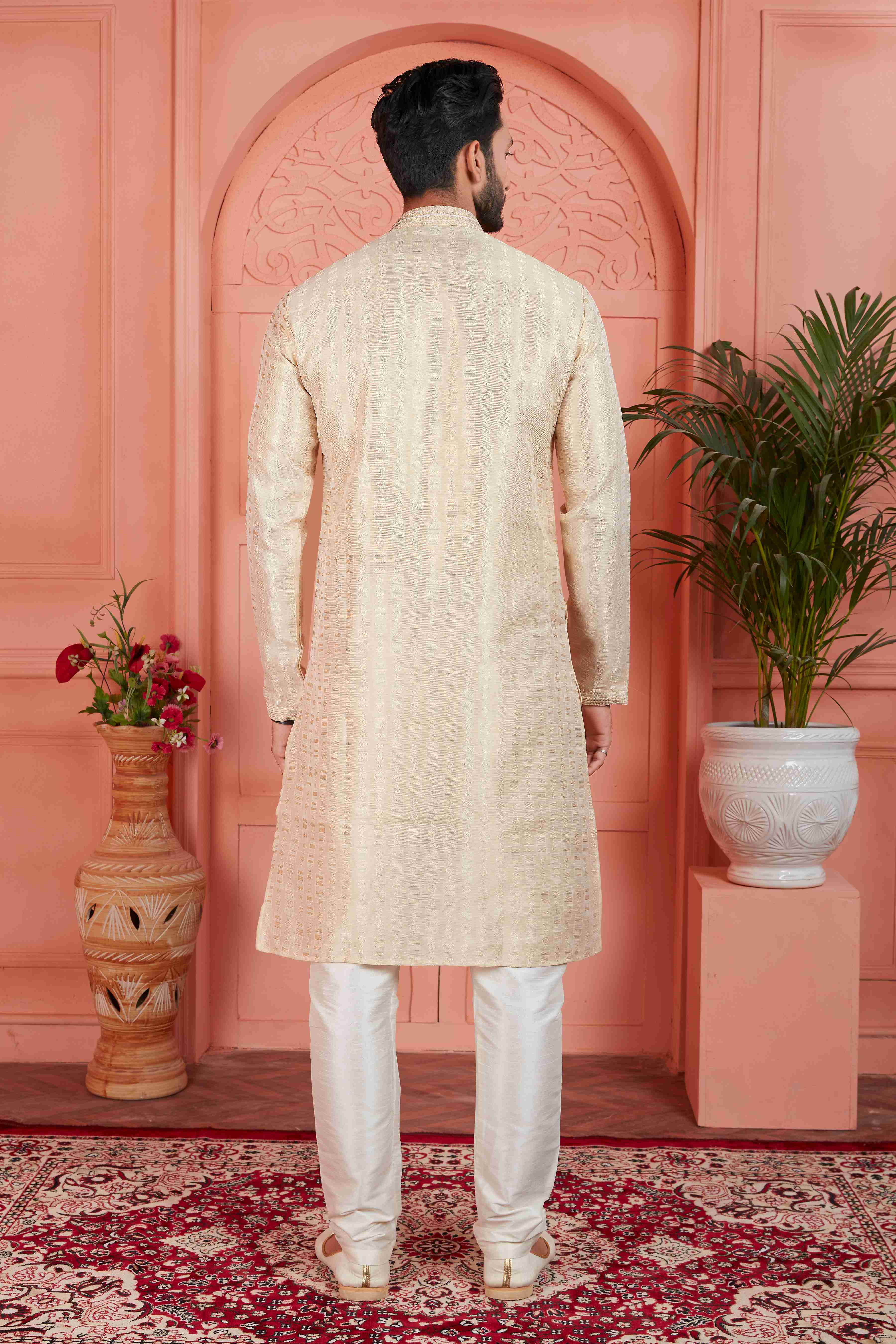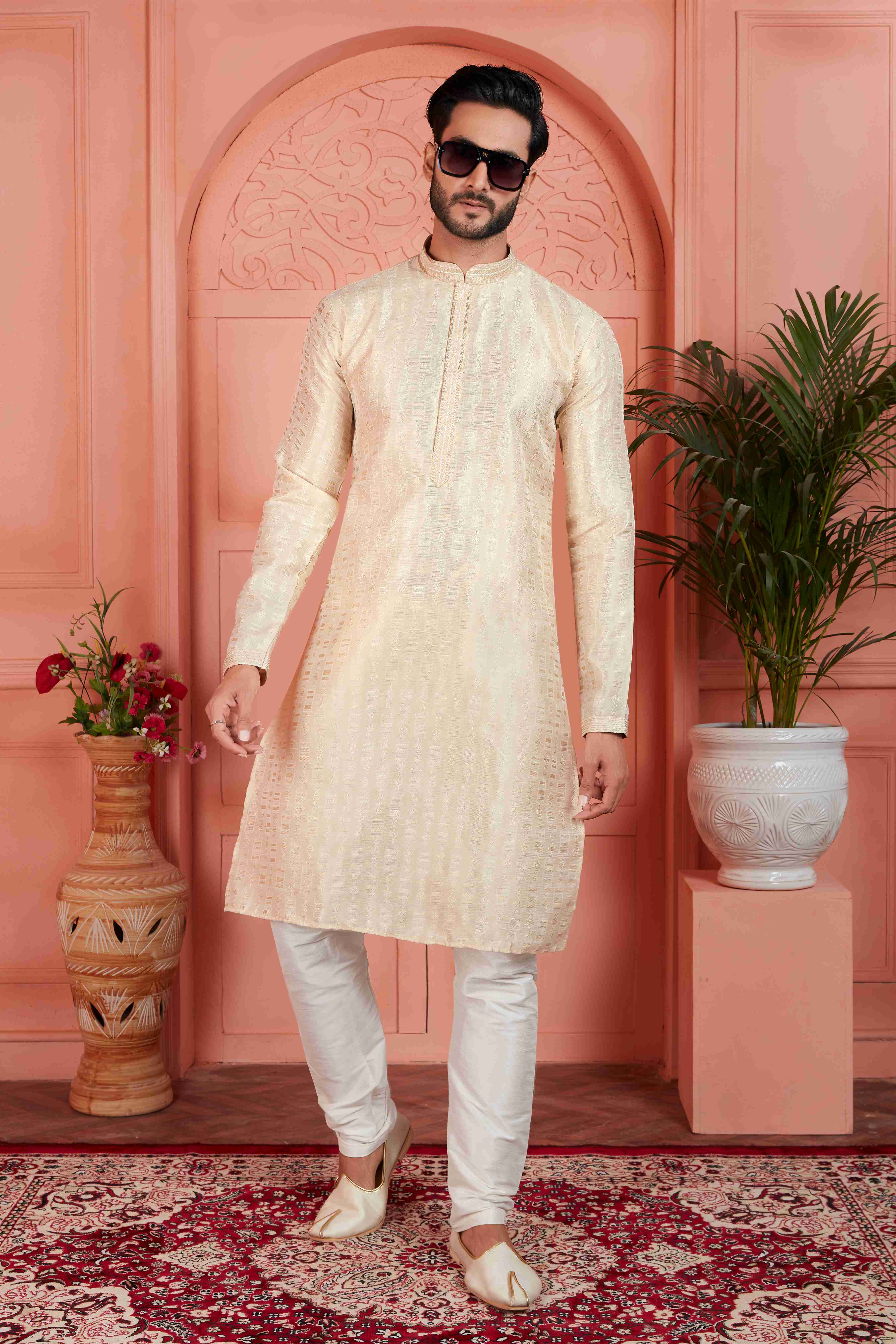 Raivat Ethnic Men's Jacquard Silk Brocade Pintux Work Kurta Pyjama In Cream Colour