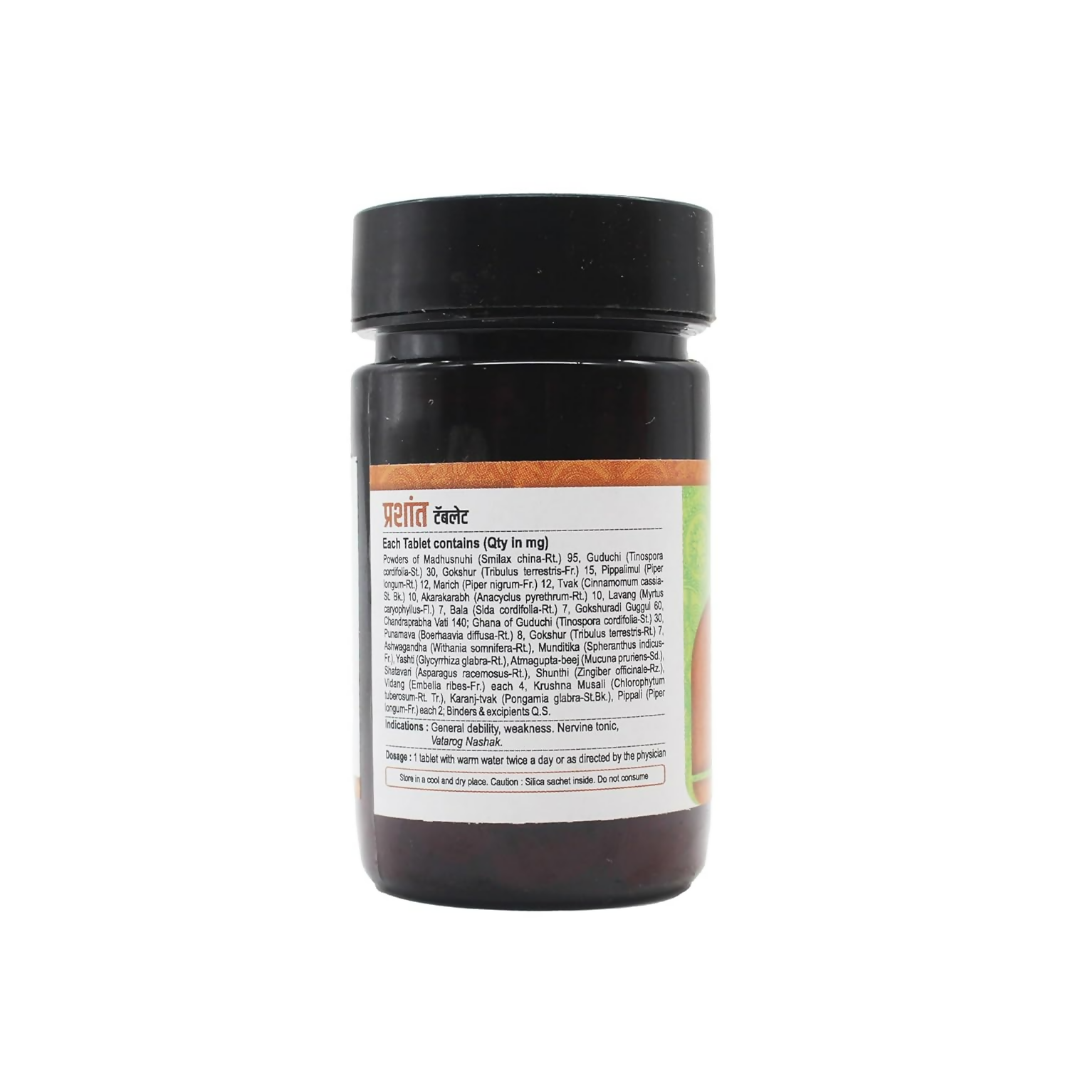 • Each Tablet contains (Qty in mg) Powders of Madhusnuhi (Smilax china-Rt,) 95, Guduchi (Tinospora cordifolia-St.) 30, Gokshur (Tribulus terrestris-Fr.) 15, Pippalimul (Piper longum-Rt,) 12, Marich (Piper nigrum-Fr,) 12, Tvak (Cinamomum cassia-St.Bk.) 10, Akarakarabh (Anacyclus pyrethrum-Rt.) 10, Lavang (Myrtus caryophyllus-Fl,) 7, Bala (Sida cordifolia-St.) 7, Gokshuradi Guggulu Chandraprabha Vat 140; Ghana of Guduchi (Tinospora cordifolia-St) 30, Punarnava (Boerhaavia diffusa-Rt.) 8, Gokshur (Tribulus terastis-Ri)7, Ashwagandha [Withania somnifera-Rt), Munditika (Spheranthus indicus Yashti (Glycymhiza glabra-Rt.), Atmagupta-beej (Mucuna pruriens-Sd, Shatavari (Asparagus racemosus-Rt.), Shunthi (Zingiber oficinale Rz.) Vidang (Embelia ribes-Fr.) each 4, Krushna Musalli (Chlorophyum tiberosum-Rt. Tr.)., Karanj-tvak (Pongamia glabra-St.Bk.), Pipali (Piper Iongum-Fr.) each 2: Binders excipients Q.S.