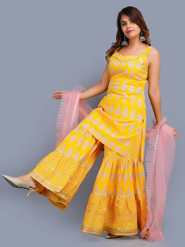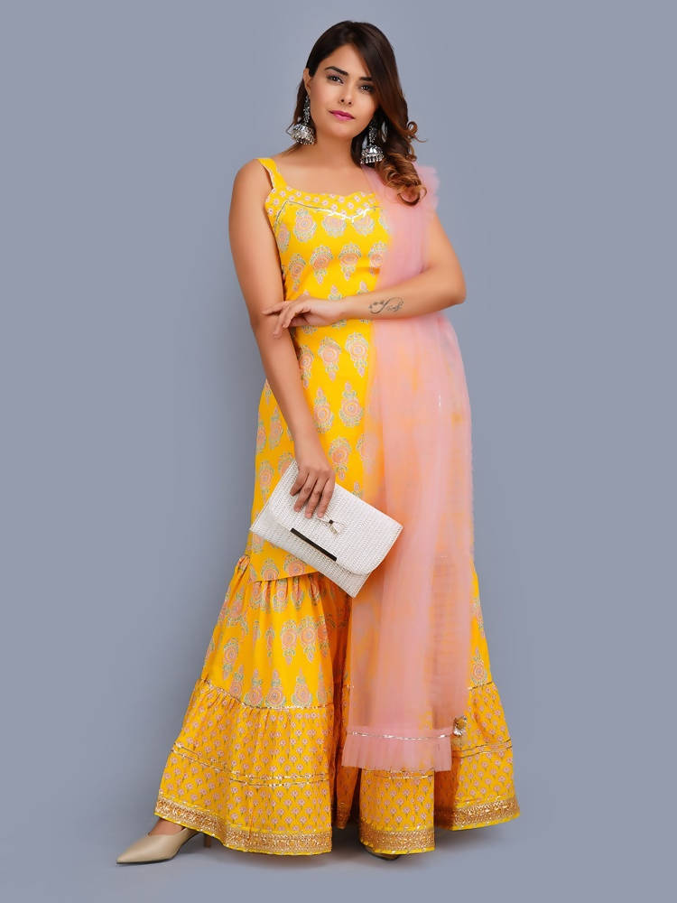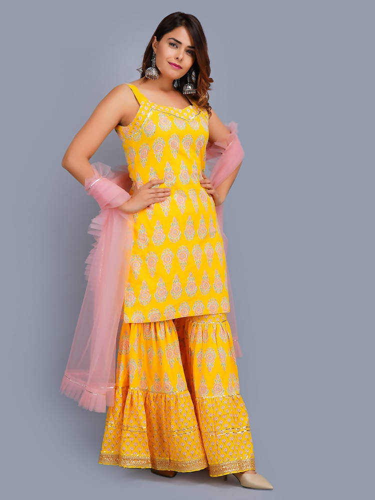 Shehnai Yellow Printed Strap Short Kurta With Sharara Set And Net Dupatta