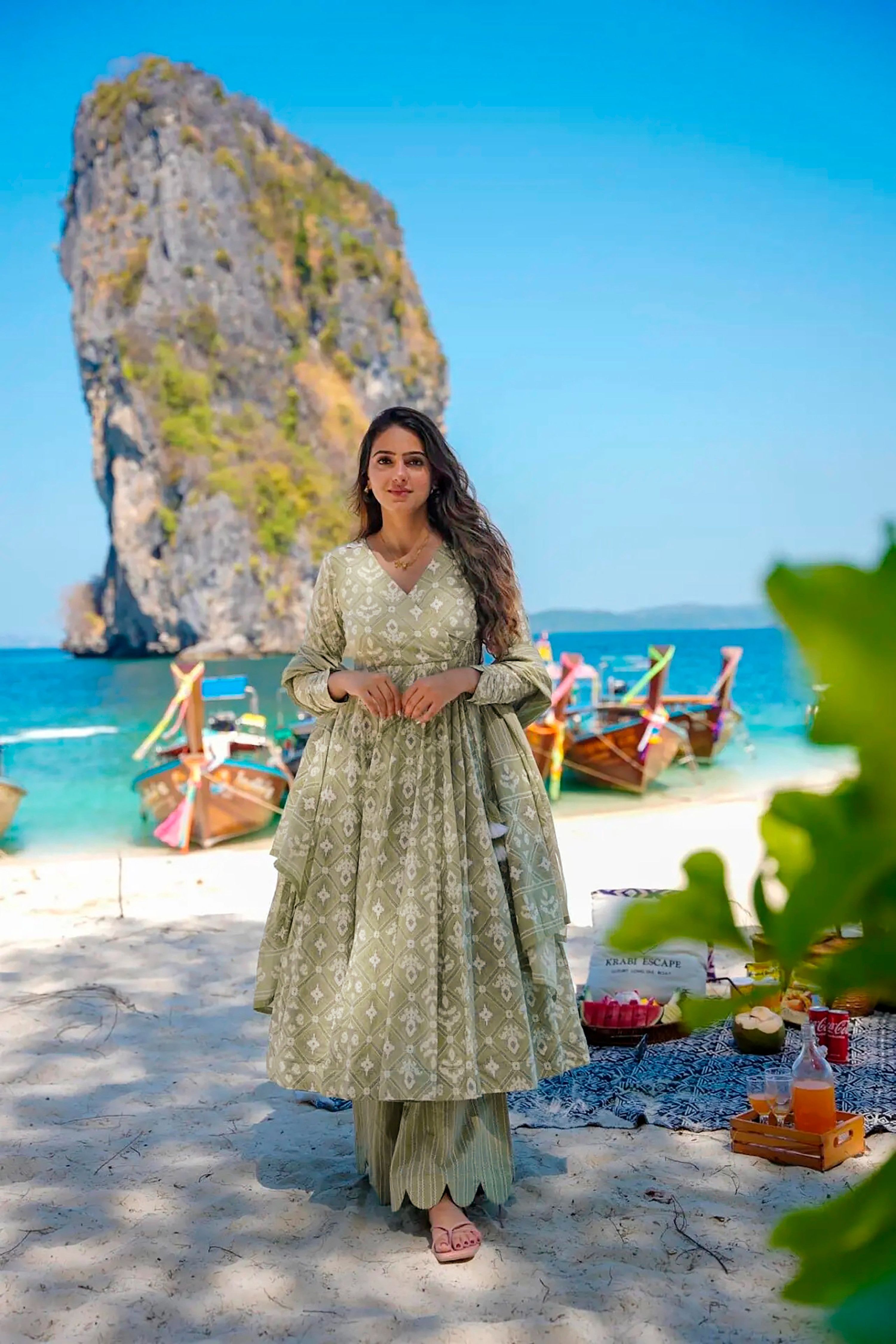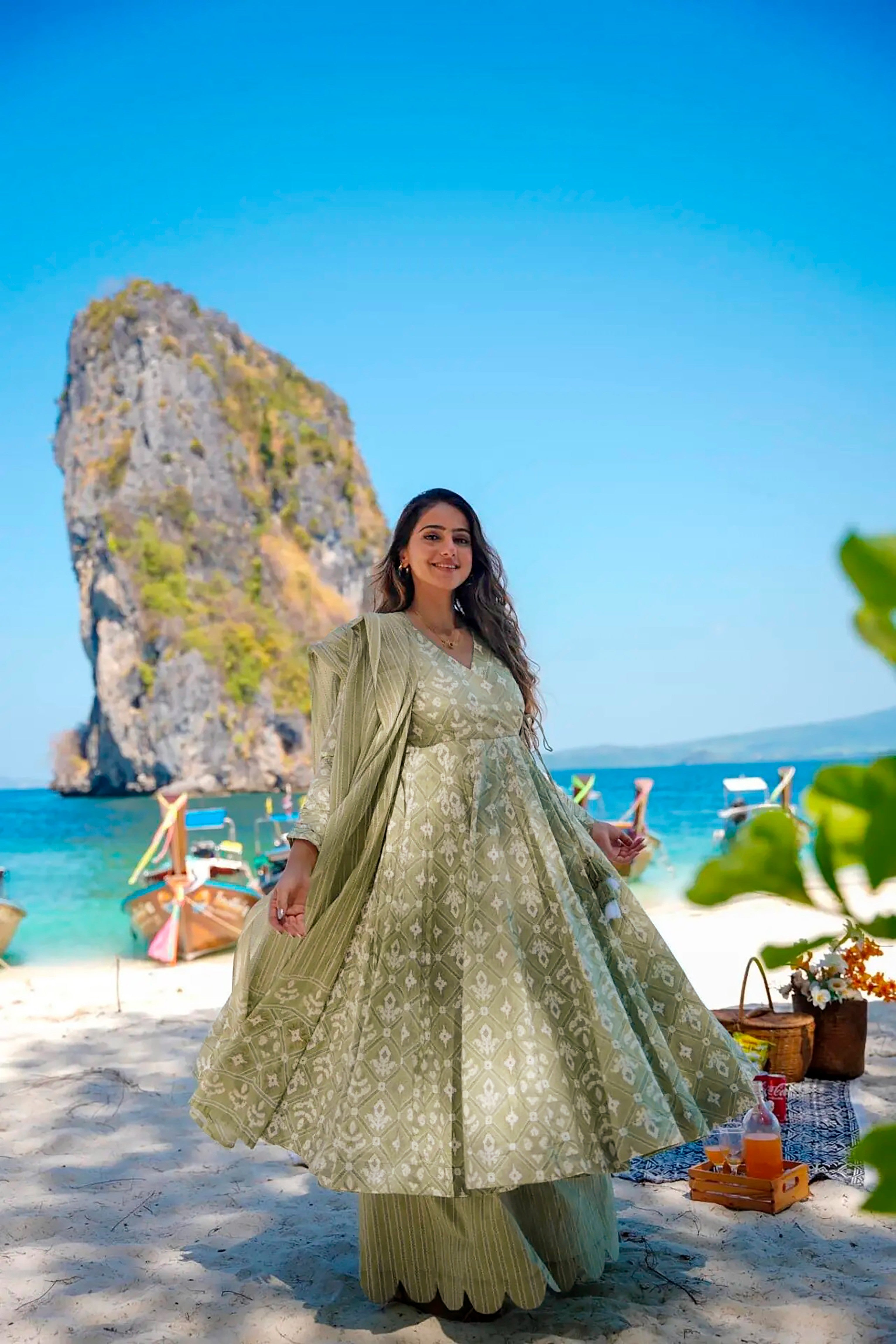 Sonakshi Women's Baby Green Maslin Digital Print Full Round Flair Anarkali Gown Set With Dupatta