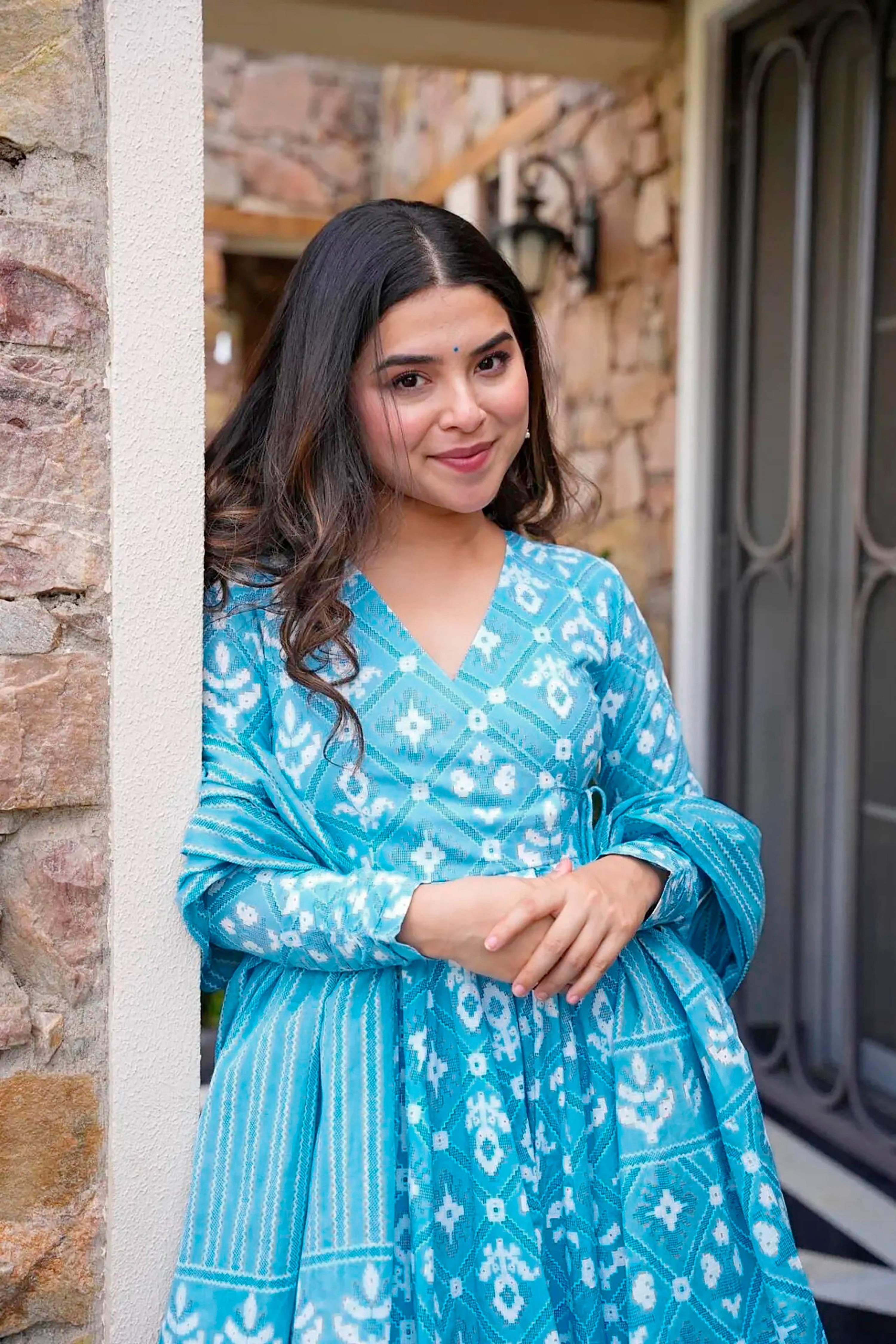 Sonakshi Women's Bright Blue Maslin Digital Print Full Round Flair Anarkali Gown Set With Dupatta