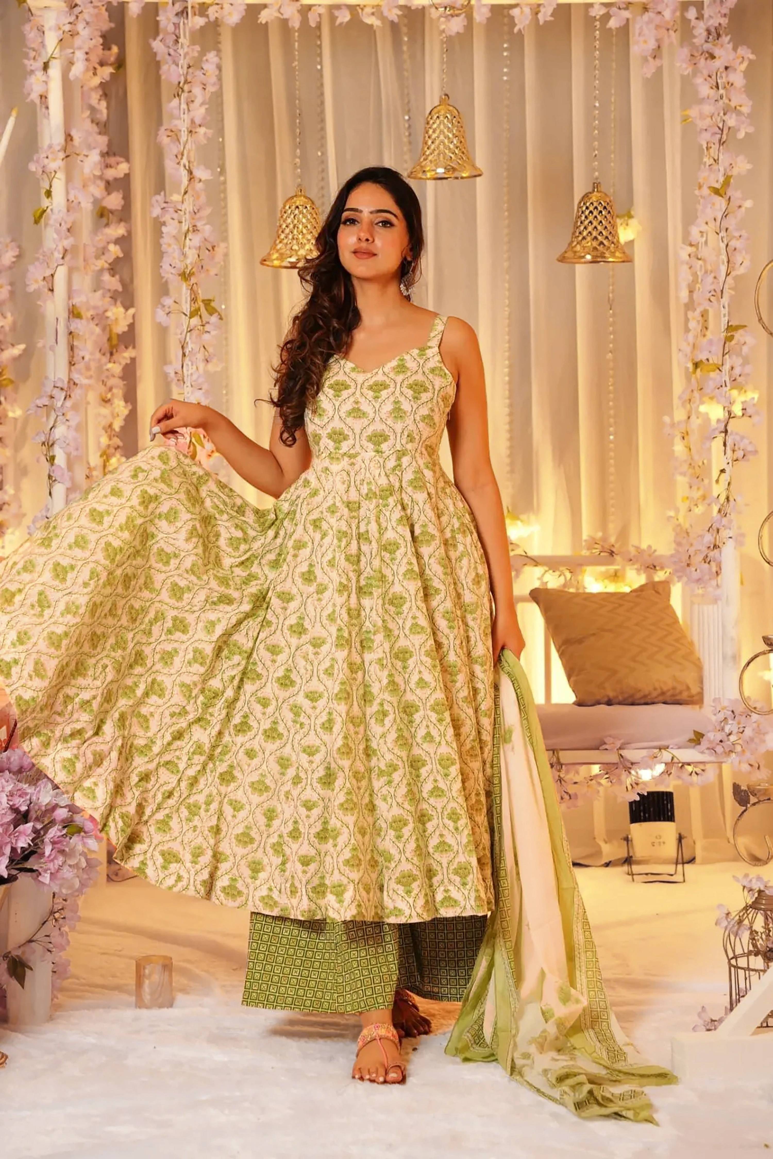 Sonakshi Women's Green Maslin Digital Print Full Round Flair Anarkali Gown Set With Dupatta