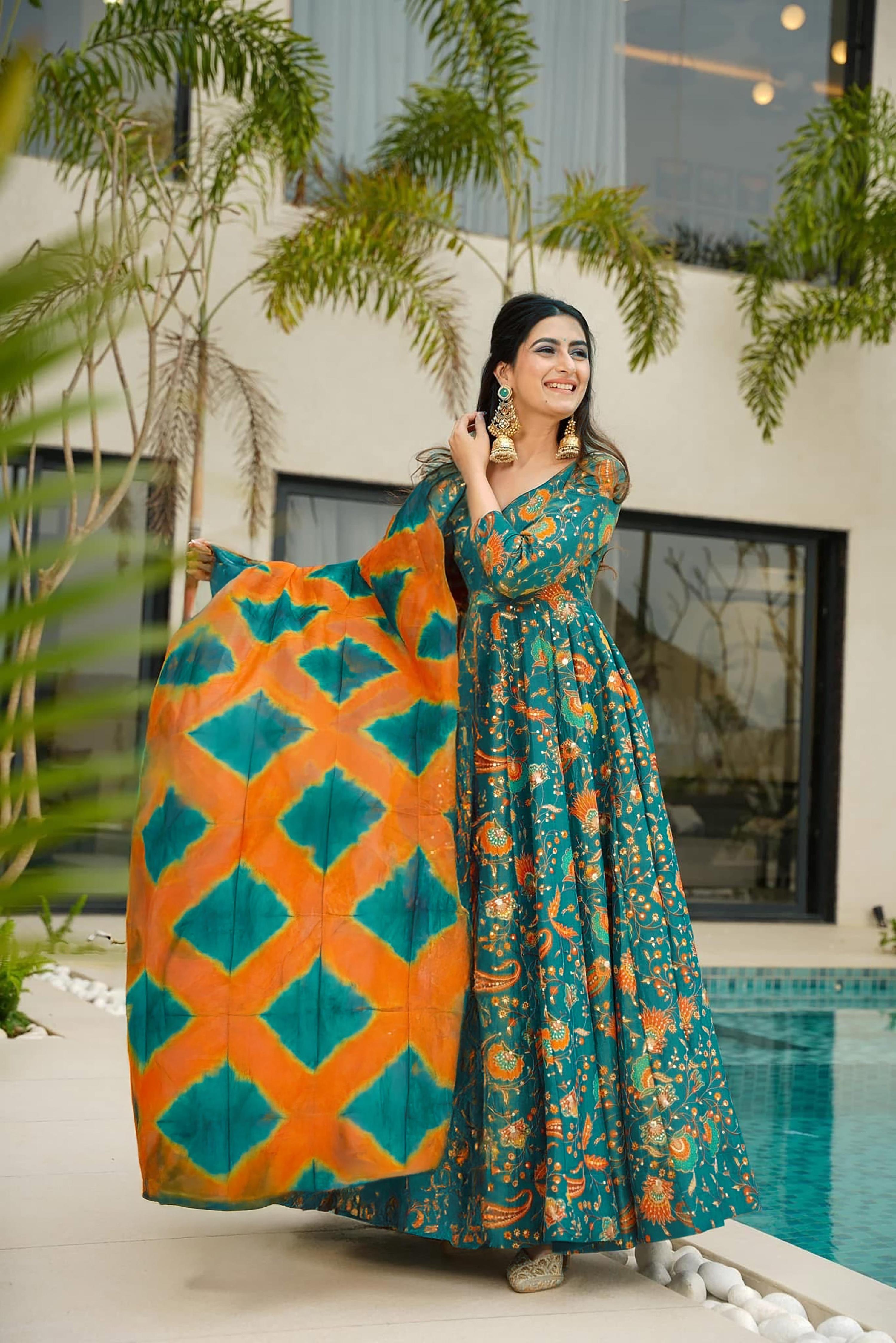 Sonakshi Women's Green Silk Digital Print Full Round Flair Anarkali Gown Set With Dupatta