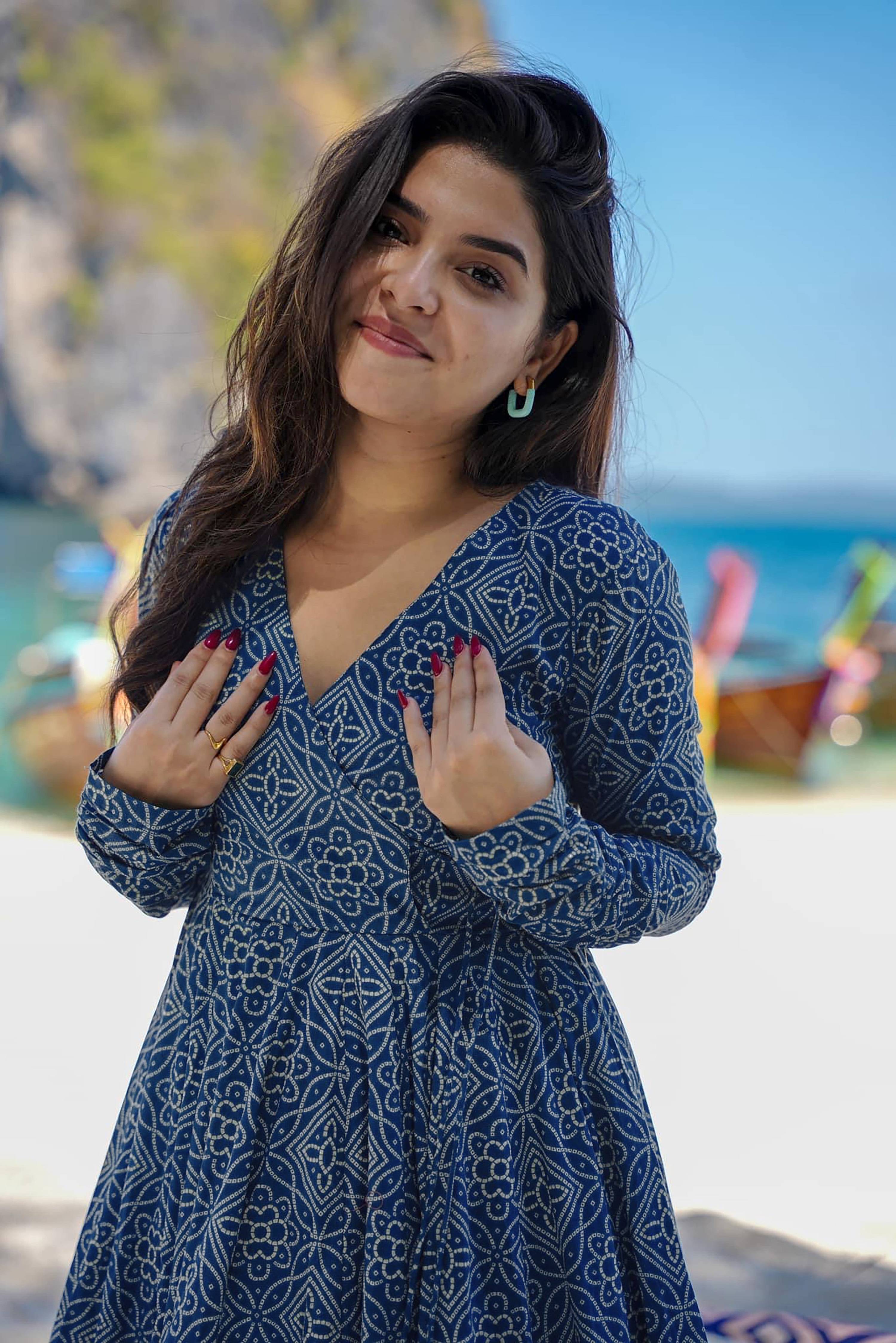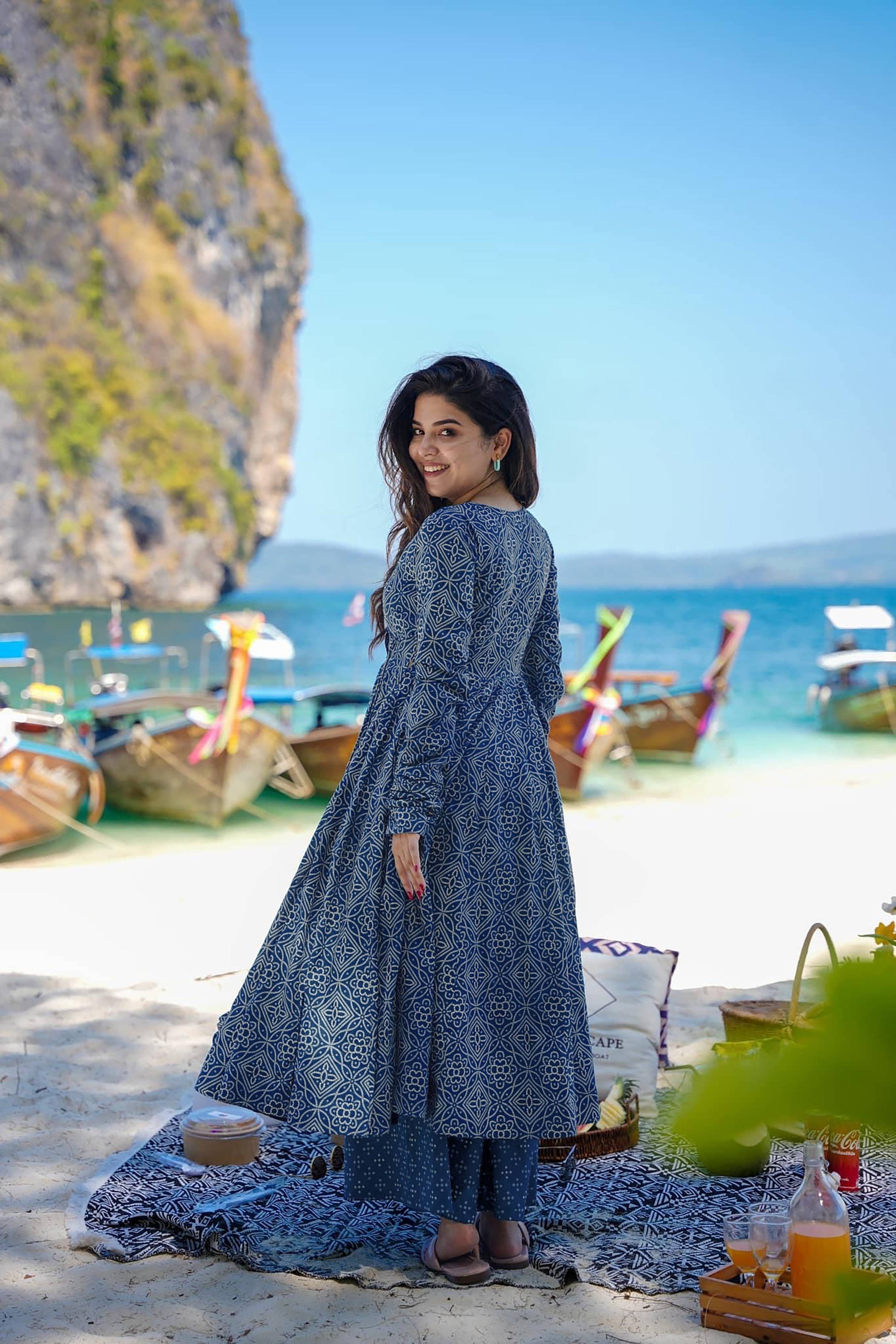 Sonakshi Women's Navy Blue Maslin Digital Print Full Round Flair Anarkali Gown Set With Dupatta