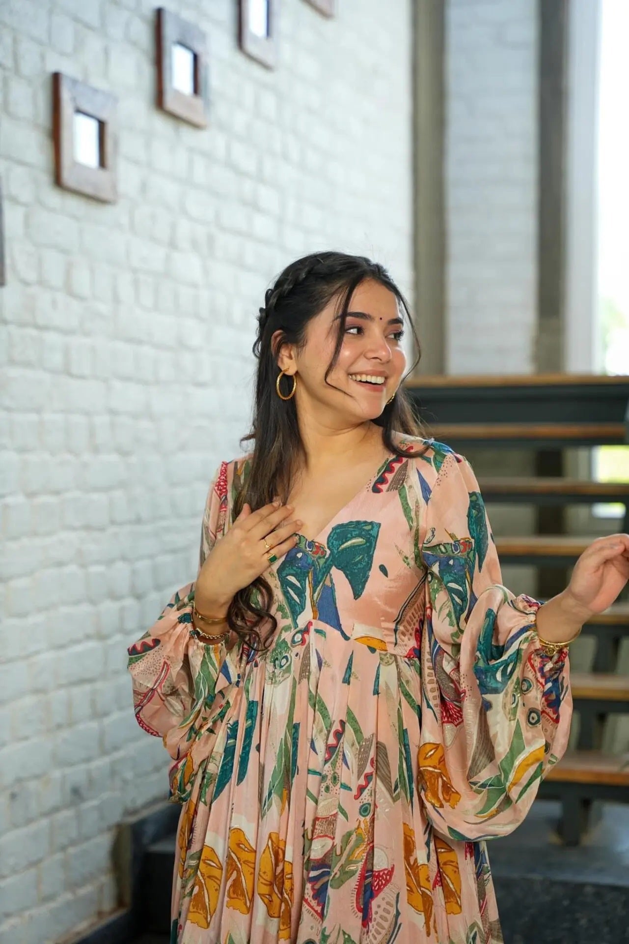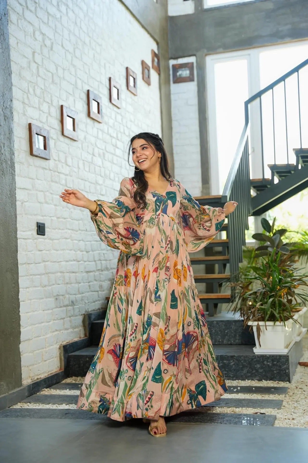 Sonakshi Women's Peach Air tex Chinon Digital Print Full Round Flair Anarkali Gown Set