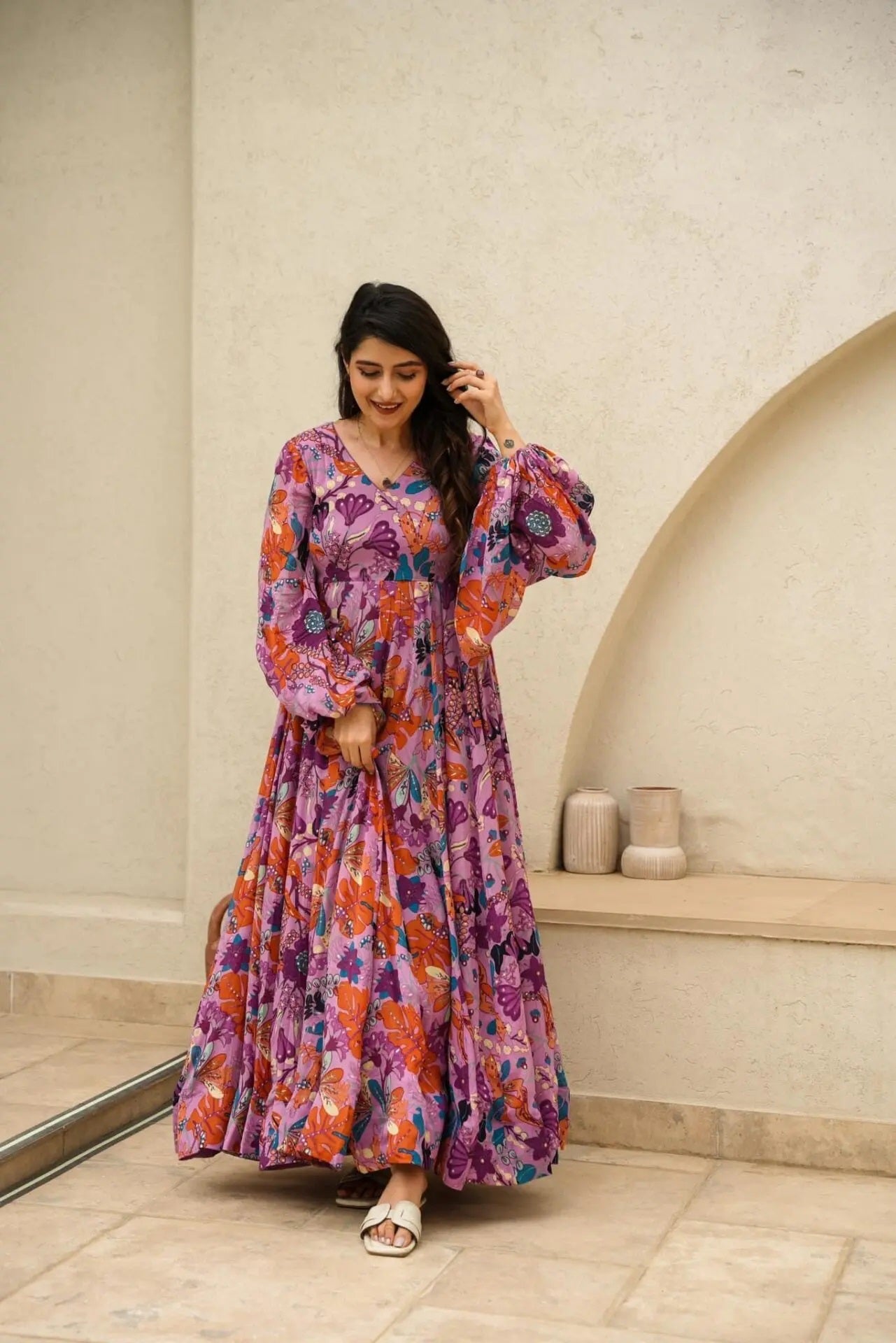 Sonakshi Women's Pink Air tex Chinon Digital Print Full Round Flair Anarkali Gown Set