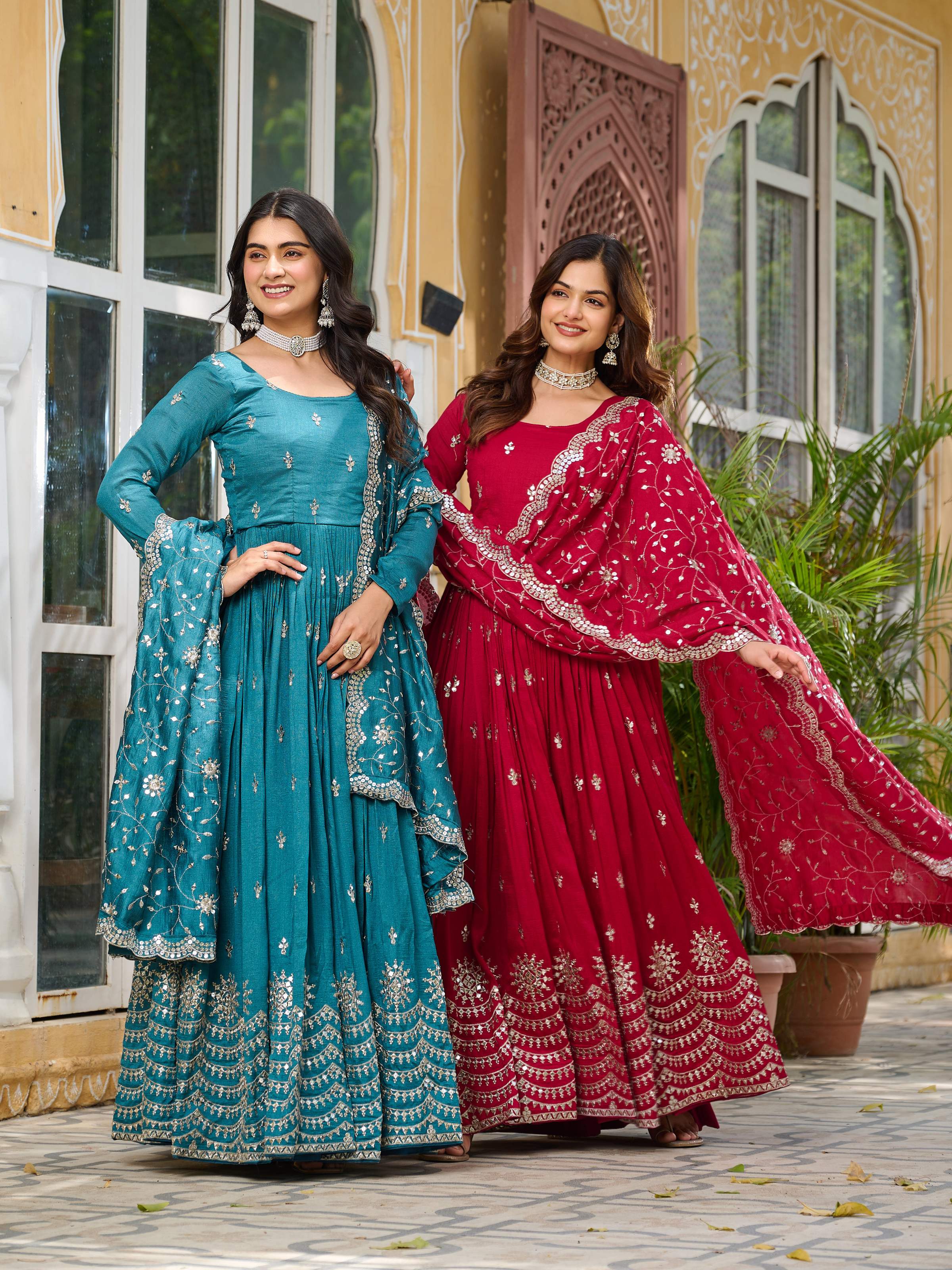 Sonakshi Women's Rani & Teal Vichitra Silk Sequence Embroidered Anarkali Gown Set With Dupatta