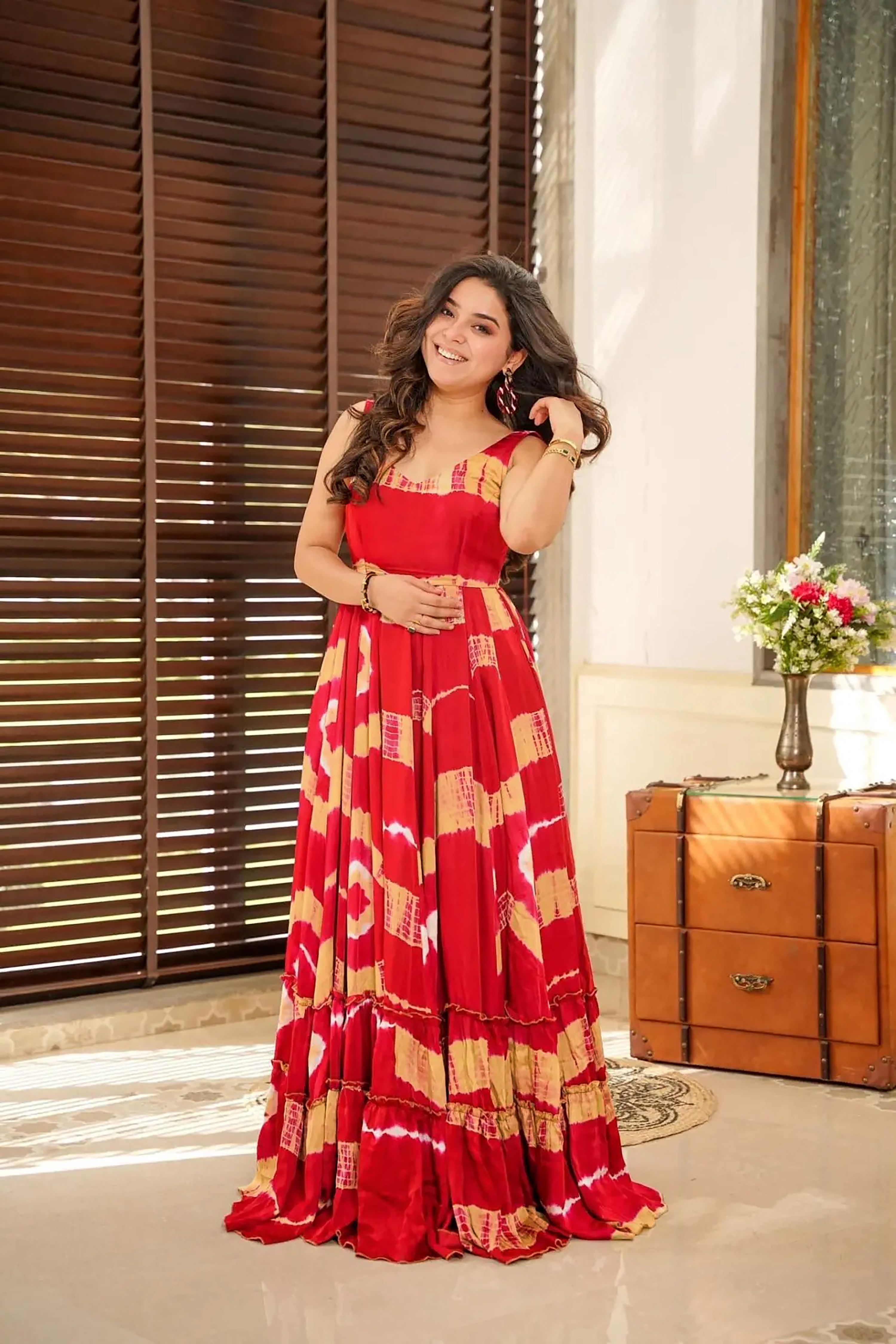 Sonakshi Women's Red Heavy Rayon Digital Print Full Round Flair Anarkali Gown Set