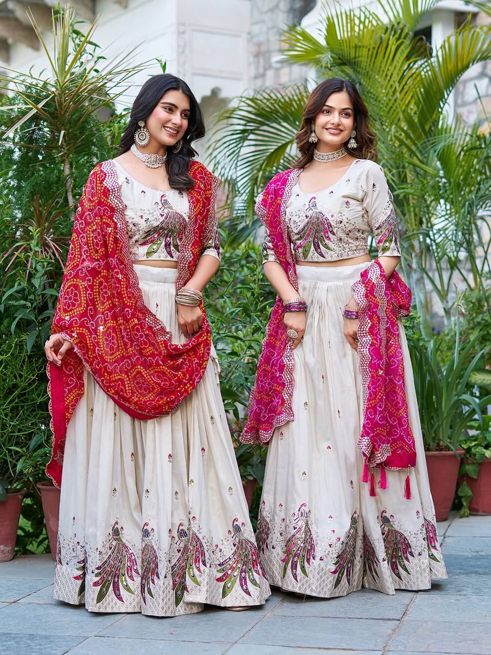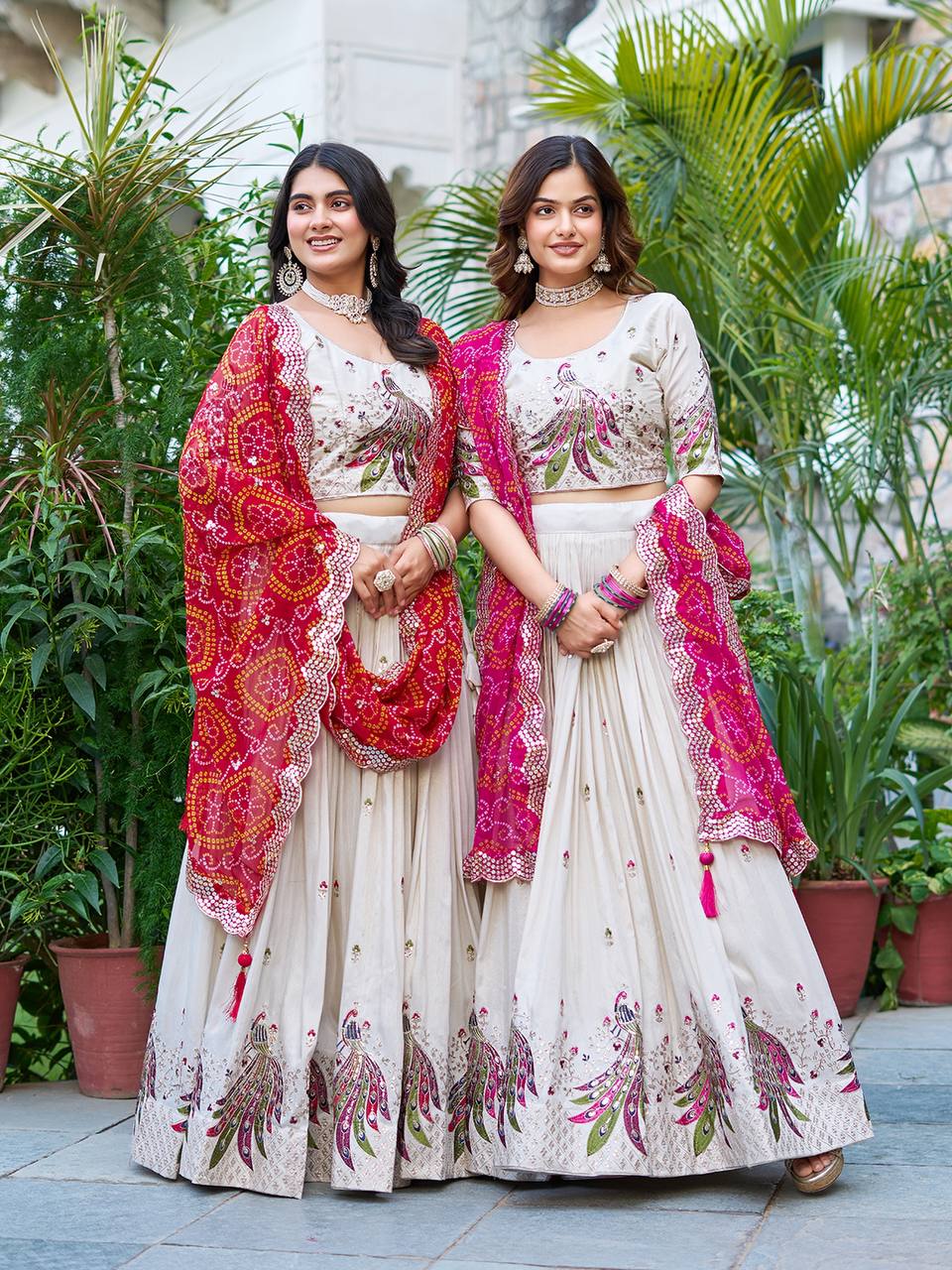 Sonakshi Women's Red & Rani Tissue Silk Thread Embroidered Sequence Lehenga Set With Dupatta