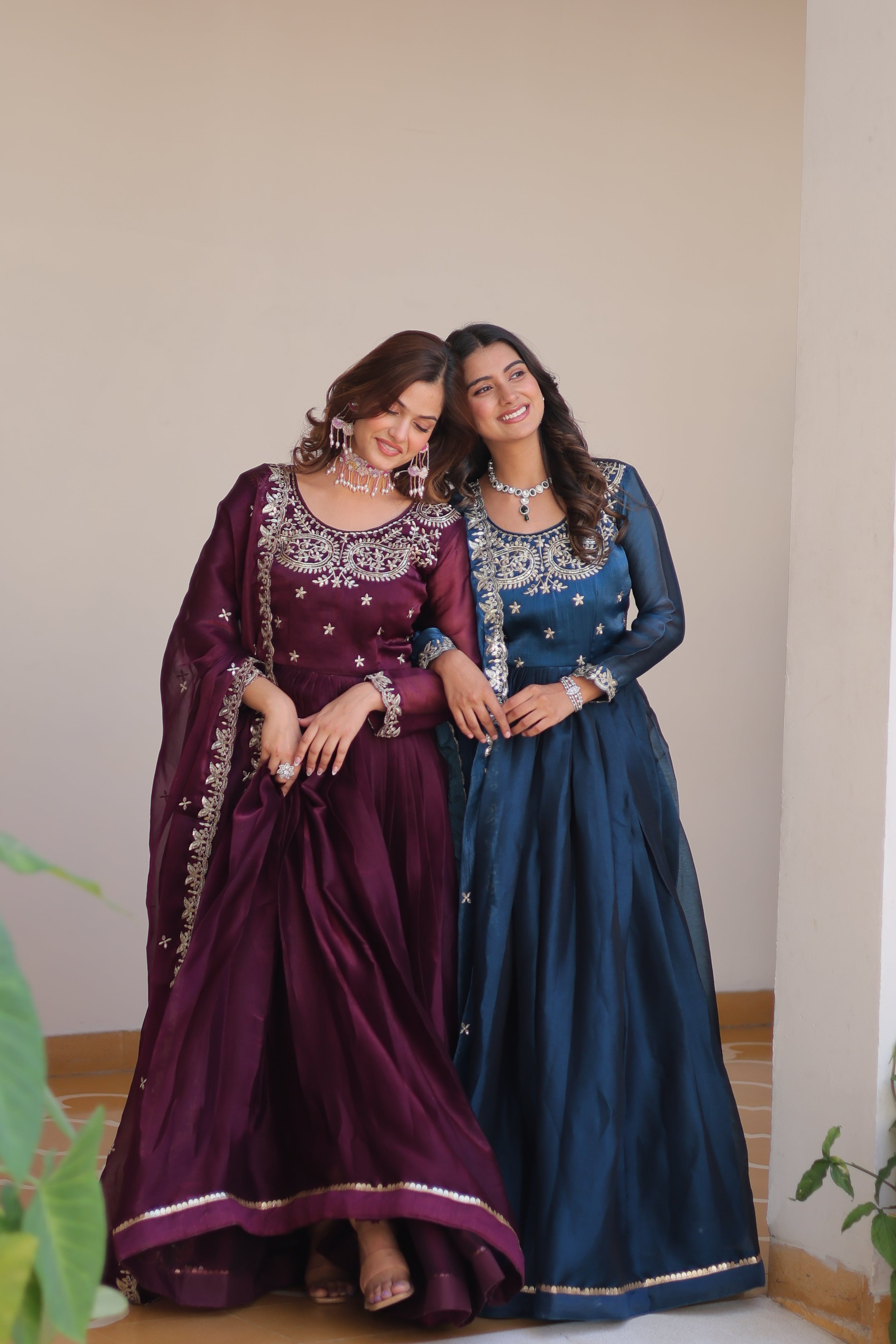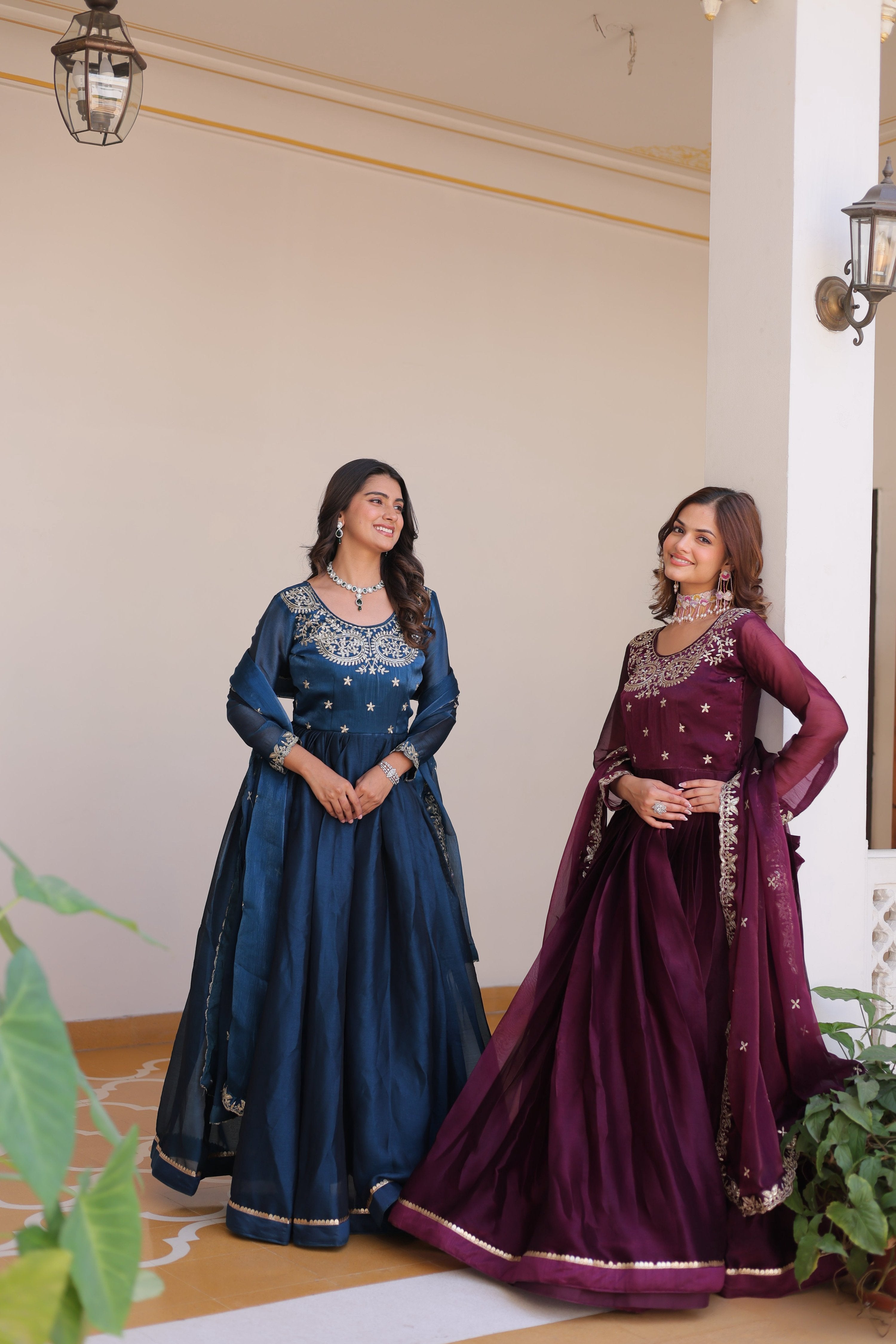 Sonakshi Women's Teal & Wine Burberry Silk Sequence Embroidered Anarkali Gown Set With Dupatta