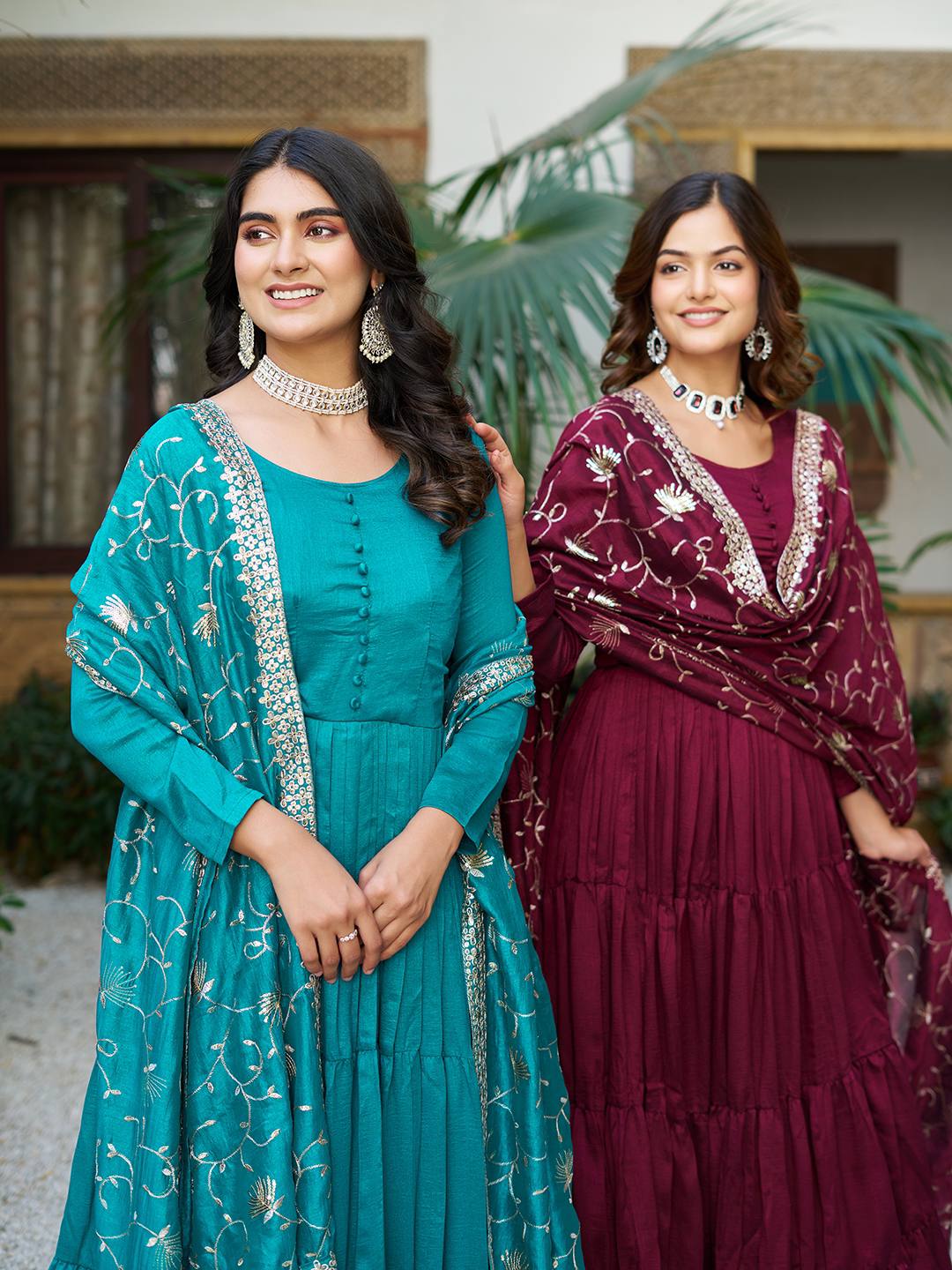 Sonakshi Women's Teal & Wine Vichitra Silk Sequence Embroidered Anarkali Gown Set With Dupatta