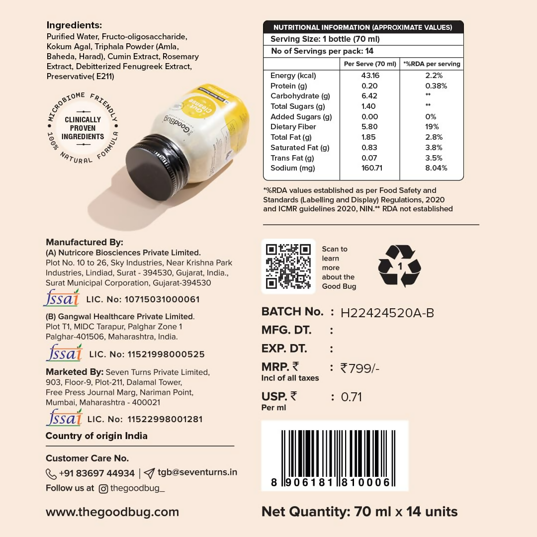 The Good Bug Gut Cleanse comes as a 14-day regimen of prebiotic shots. Each 70ml shot contains a combination of plant-based ingredients, prebiotics, and natural extracts, intended for general digestive support as part of a daily routine.