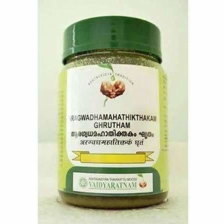 Vaidyaratnam Aragwadhamahathikthakam Ghrutham is an Ayurvedic formulation. This herbal ghee is traditionally used for skin disorders.