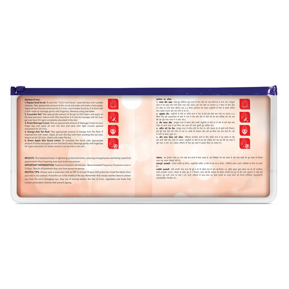 VLCC Fruit Facial Kit is formulated with fruit and vegetable extracts like watermelon, peach, orange and cucumber, along with Papaya, this Fruit Facial Kit helps achieve a blemish-free, radiant complexion. Papaya, often referred to as the “fruit of the angels" is a rich source of an enzyme called "papain" and vitamin A, which together help in breaking down inactive proteins and thereby sloughing off dead skin cells. It also hydrates the skin and adds a natural luminosity.